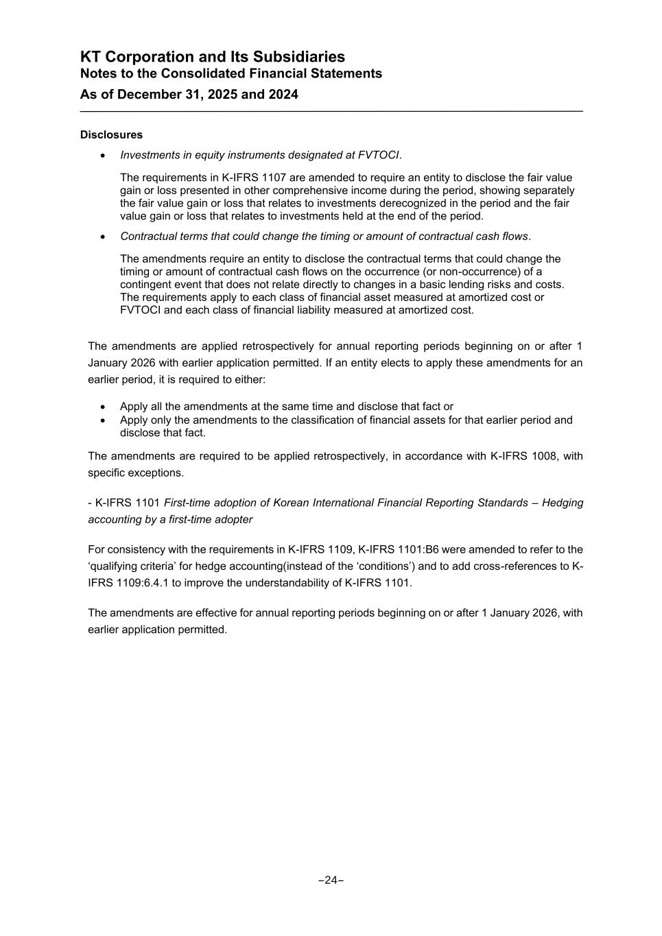 KT Corporation and Its Subsidiaries Notes to the Consolidated Financial Statements As of December 31, 2025 and 2024 Disclosures • Investments in equity instruments designated at FVTOCI. The requirements in K-IFRS 1107 are amended to require an entity to disclose the fair value gain or loss presented in other comprehensive income during the period, showing separately the fair value gain or loss that relates to investments derecognized in the period and the fair value gain or loss that relates to investments held at the end of the period. • Contractual terms that could change the timing or amount of contractual cash flows. The amendments require an entity to disclose the contractual terms that could change the timing or amount of contractual cash flows on the occurrence (or non-occurrence) of a contingent event that does not relate directly to changes in a basic lending risks and costs. The requirements apply to each class of financial asset measured at amortized cost or FVTOCI and each class of financial liability measured at amortized cost. The amendments are applied retrospectively for annual reporting periods beginning on or after 1 January 2026 with earlier application permitted. If an entity elects to apply these amendments for an earlier period, it is required to either: • Apply all the amendments at the same time and disclose that fact or • Apply only the amendments to the classification of financial assets for that earlier period and disclose that fact. The amendments are required to be applied retrospectively, in accordance with K-IFRS 1008, with specific exceptions. - K-IFRS 1101 First-time adoption of Korean International Financial Reporting Standards – Hedging accounting by a first-time adopter For consistency with the requirements in K-IFRS 1109, K-IFRS 1101:B6 were amended to refer to the ‘qualifying criteria’ for hedge accounting(instead of the ‘conditions’) and to add cross-references to K- IFRS 1109:6.4.1 to improve the understandability of K-IFRS 1101. The amendments are effective for annual reporting periods beginning on or after 1 January 2026, with earlier application permitted. -24-