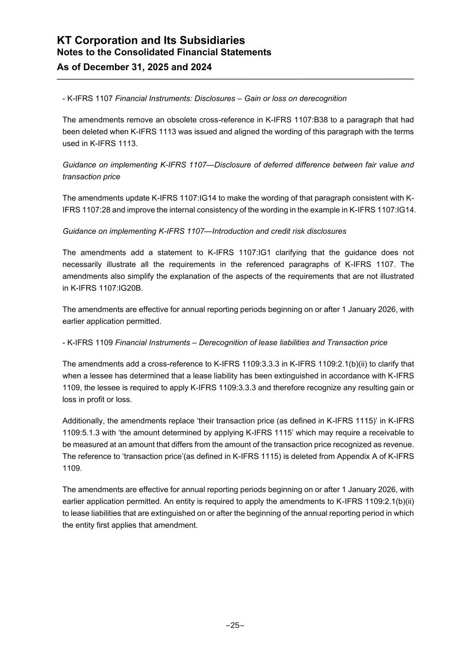 KT Corporation and Its Subsidiaries Notes to the Consolidated Financial Statements As of December 31, 2025 and 2024 - K-IFRS 1107 Financial Instruments: Disclosures – Gain or loss on derecognition The amendments remove an obsolete cross-reference in K-IFRS 1107:B38 to a paragraph that had been deleted when K-IFRS 1113 was issued and aligned the wording of this paragraph with the terms used in K-IFRS 1113. Guidance on implementing K-IFRS 1107—Disclosure of deferred difference between fair value and transaction price The amendments update K-IFRS 1107:IG14 to make the wording of that paragraph consistent with K- IFRS 1107:28 and improve the internal consistency of the wording in the example in K-IFRS 1107:IG14. Guidance on implementing K-IFRS 1107—Introduction and credit risk disclosures The amendments add a statement to K-IFRS 1107:IG1 clarifying that the guidance does not necessarily illustrate all the requirements in the referenced paragraphs of K-IFRS 1107. The amendments also simplify the explanation of the aspects of the requirements that are not illustrated in K-IFRS 1107:IG20B. The amendments are effective for annual reporting periods beginning on or after 1 January 2026, with earlier application permitted. - K-IFRS 1109 Financial Instruments – Derecognition of lease liabilities and Transaction price The amendments add a cross-reference to K-IFRS 1109:3.3.3 in K-IFRS 1109:2.1(b)(ii) to clarify that when a lessee has determined that a lease liability has been extinguished in accordance with K-IFRS 1109, the lessee is required to apply K-IFRS 1109:3.3.3 and therefore recognize any resulting gain or loss in profit or loss. Additionally, the amendments replace ‘their transaction price (as defined in K-IFRS 1115)’ in K-IFRS 1109:5.1.3 with ‘the amount determined by applying K-IFRS 1115’ which may require a receivable to be measured at an amount that differs from the amount of the transaction price recognized as revenue. The reference to ‘transaction price’(as defined in K-IFRS 1115) is deleted from Appendix A of K-IFRS 1109. The amendments are effective for annual reporting periods beginning on or after 1 January 2026, with earlier application permitted. An entity is required to apply the amendments to K-IFRS 1109:2.1(b)(ii) to lease liabilities that are extinguished on or after the beginning of the annual reporting period in which the entity first applies that amendment. -25-