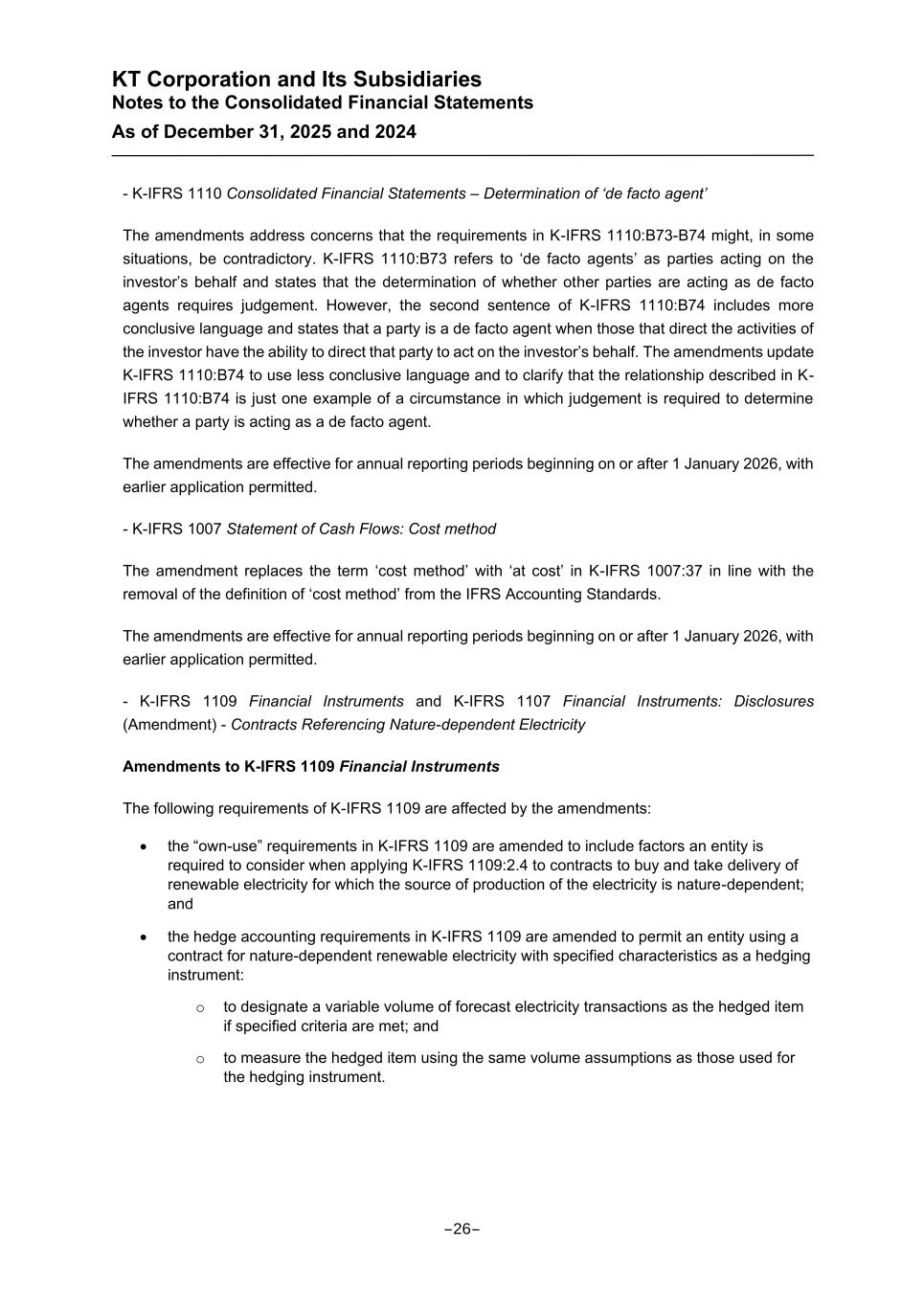 KT Corporation and Its Subsidiaries Notes to the Consolidated Financial Statements As of December 31, 2025 and 2024 - K-IFRS 1110 Consolidated Financial Statements – Determination of ‘de facto agent’ The amendments address concerns that the requirements in K-IFRS 1110:B73-B74 might, in some situations, be contradictory. K-IFRS 1110:B73 refers to ‘de facto agents’ as parties acting on the investor’s behalf and states that the determination of whether other parties are acting as de facto agents requires judgement. However, the second sentence of K-IFRS 1110:B74 includes more conclusive language and states that a party is a de facto agent when those that direct the activities of the investor have the ability to direct that party to act on the investor’s behalf. The amendments update K-IFRS 1110:B74 to use less conclusive language and to clarify that the relationship described in K- IFRS 1110:B74 is just one example of a circumstance in which judgement is required to determine whether a party is acting as a de facto agent. The amendments are effective for annual reporting periods beginning on or after 1 January 2026, with earlier application permitted. - K-IFRS 1007 Statement of Cash Flows: Cost method The amendment replaces the term ‘cost method’ with ‘at cost’ in K-IFRS 1007:37 in line with the removal of the definition of ‘cost method’ from the IFRS Accounting Standards. The amendments are effective for annual reporting periods beginning on or after 1 January 2026, with earlier application permitted. - K-IFRS 1109 Financial Instruments and K-IFRS 1107 Financial Instruments: Disclosures (Amendment) - Contracts Referencing Nature-dependent Electricity Amendments to K-IFRS 1109 Financial Instruments The following requirements of K-IFRS 1109 are affected by the amendments: • the “own-use” requirements in K-IFRS 1109 are amended to include factors an entity is required to consider when applying K-IFRS 1109:2.4 to contracts to buy and take delivery of renewable electricity for which the source of production of the electricity is nature-dependent; and • the hedge accounting requirements in K-IFRS 1109 are amended to permit an entity using a contract for nature-dependent renewable electricity with specified characteristics as a hedging instrument: o to designate a variable volume of forecast electricity transactions as the hedged item if specified criteria are met; and o to measure the hedged item using the same volume assumptions as those used for the hedging instrument. -26-