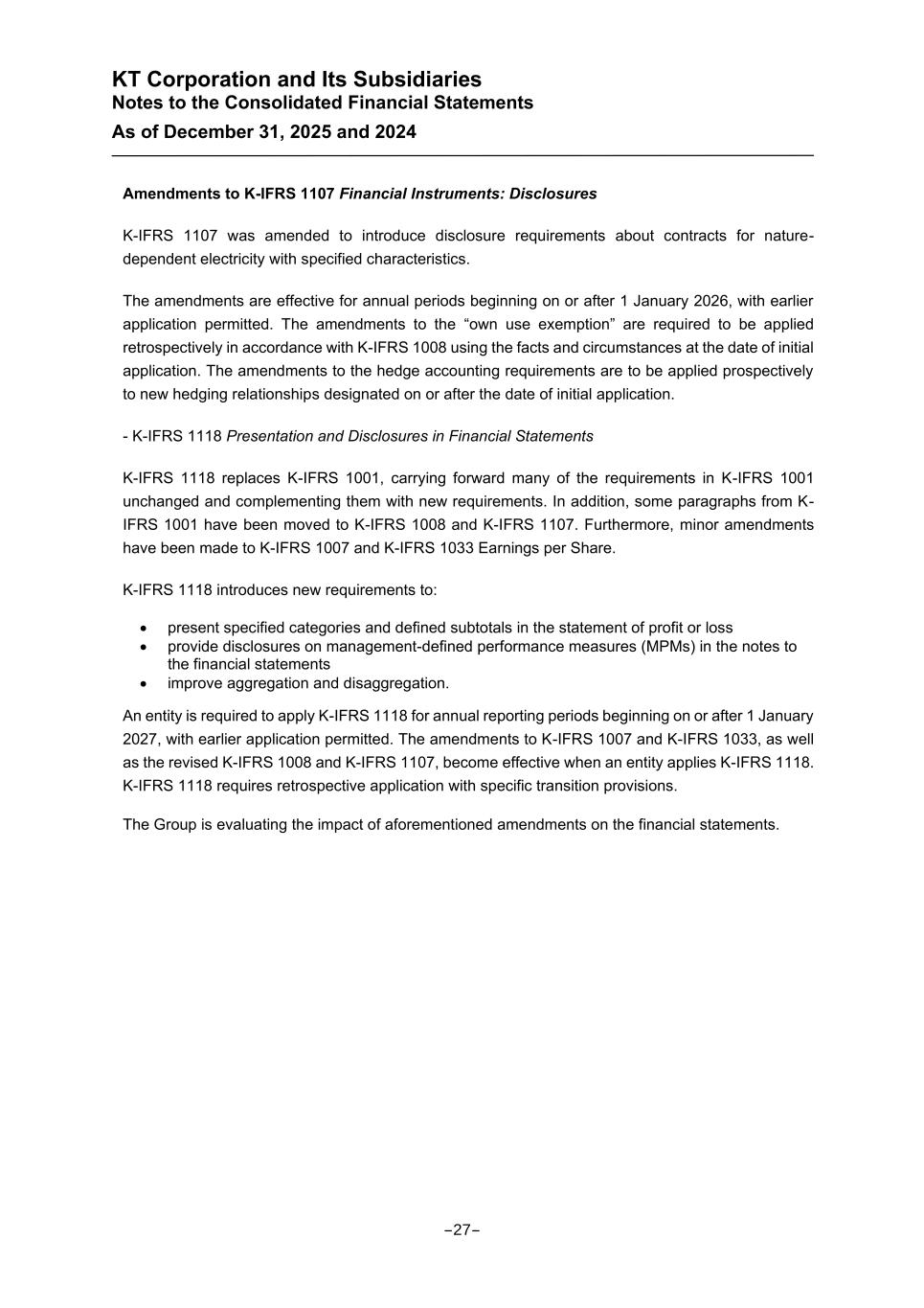 KT Corporation and Its Subsidiaries Notes to the Consolidated Financial Statements As of December 31, 2025 and 2024 Amendments to K-IFRS 1107 Financial Instruments: Disclosures K-IFRS 1107 was amended to introduce disclosure requirements about contracts for nature- dependent electricity with specified characteristics. The amendments are effective for annual periods beginning on or after 1 January 2026, with earlier application permitted. The amendments to the “own use exemption” are required to be applied retrospectively in accordance with K-IFRS 1008 using the facts and circumstances at the date of initial application. The amendments to the hedge accounting requirements are to be applied prospectively to new hedging relationships designated on or after the date of initial application. - K-IFRS 1118 Presentation and Disclosures in Financial Statements K-IFRS 1118 replaces K-IFRS 1001, carrying forward many of the requirements in K-IFRS 1001 unchanged and complementing them with new requirements. In addition, some paragraphs from K- IFRS 1001 have been moved to K-IFRS 1008 and K-IFRS 1107. Furthermore, minor amendments have been made to K-IFRS 1007 and K-IFRS 1033 Earnings per Share. K-IFRS 1118 introduces new requirements to: • present specified categories and defined subtotals in the statement of profit or loss • provide disclosures on management-defined performance measures (MPMs) in the notes to the financial statements • improve aggregation and disaggregation. An entity is required to apply K-IFRS 1118 for annual reporting periods beginning on or after 1 January 2027, with earlier application permitted. The amendments to K-IFRS 1007 and K-IFRS 1033, as well as the revised K-IFRS 1008 and K-IFRS 1107, become effective when an entity applies K-IFRS 1118. K-IFRS 1118 requires retrospective application with specific transition provisions. The Group is evaluating the impact of aforementioned amendments on the financial statements. -27-