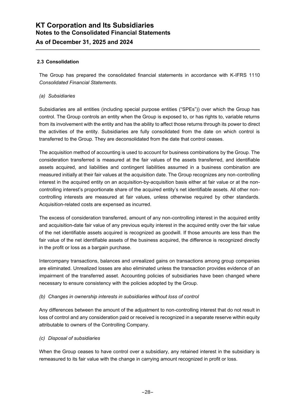 KT Corporation and Its Subsidiaries Notes to the Consolidated Financial Statements As of December 31, 2025 and 2024 2.3 Consolidation The Group has prepared the consolidated financial statements in accordance with K-IFRS 1110 Consolidated Financial Statements. (a) Subsidiaries Subsidiaries are all entities (including special purpose entities (“SPEs”)) over which the Group has control. The Group controls an entity when the Group is exposed to, or has rights to, variable returns from its involvement with the entity and has the ability to affect those returns through its power to direct the activities of the entity. Subsidiaries are fully consolidated from the date on which control is transferred to the Group. They are deconsolidated from the date that control ceases. The acquisition method of accounting is used to account for business combinations by the Group. The consideration transferred is measured at the fair values of the assets transferred, and identifiable assets acquired, and liabilities and contingent liabilities assumed in a business combination are measured initially at their fair values at the acquisition date. The Group recognizes any non-controlling interest in the acquired entity on an acquisition-by-acquisition basis either at fair value or at the non- controlling interest’s proportionate share of the acquired entity’s net identifiable assets. All other non- controlling interests are measured at fair values, unless otherwise required by other standards. Acquisition-related costs are expensed as incurred. The excess of consideration transferred, amount of any non-controlling interest in the acquired entity and acquisition-date fair value of any previous equity interest in the acquired entity over the fair value of the net identifiable assets acquired is recognized as goodwill. If those amounts are less than the fair value of the net identifiable assets of the business acquired, the difference is recognized directly in the profit or loss as a bargain purchase. Intercompany transactions, balances and unrealized gains on transactions among group companies are eliminated. Unrealized losses are also eliminated unless the transaction provides evidence of an impairment of the transferred asset. Accounting policies of subsidiaries have been changed where necessary to ensure consistency with the policies adopted by the Group. (b) Changes in ownership interests in subsidiaries without loss of control Any differences between the amount of the adjustment to non-controlling interest that do not result in loss of control and any consideration paid or received is recognized in a separate reserve within equity attributable to owners of the Controlling Company. (c) Disposal of subsidiaries When the Group ceases to have control over a subsidiary, any retained interest in the subsidiary is remeasured to its fair value with the change in carrying amount recognized in profit or loss. -28-