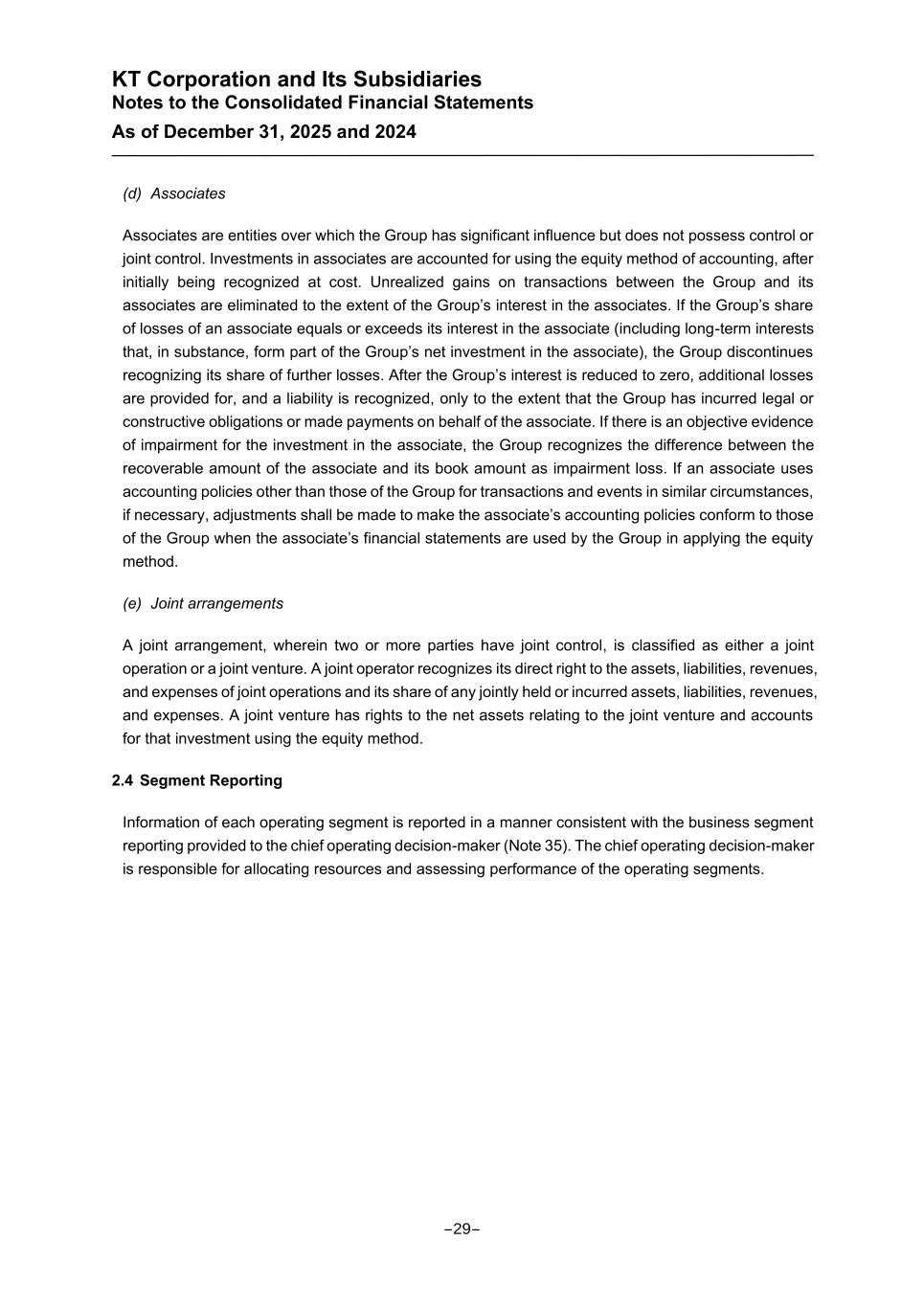 KT Corporation and Its Subsidiaries Notes to the Consolidated Financial Statements As of December 31, 2025 and 2024 (d) Associates Associates are entities over which the Group has significant influence but does not possess control or joint control. Investments in associates are accounted for using the equity method of accounting, after initially being recognized at cost. Unrealized gains on transactions between the Group and its associates are eliminated to the extent of the Group’s interest in the associates. If the Group’s share of losses of an associate equals or exceeds its interest in the associate (including long-term interests that, in substance, form part of the Group’s net investment in the associate), the Group discontinues recognizing its share of further losses. After the Group’s interest is reduced to zero, additional losses are provided for, and a liability is recognized, only to the extent that the Group has incurred legal or constructive obligations or made payments on behalf of the associate. If there is an objective evidence of impairment for the investment in the associate, the Group recognizes the difference between the recoverable amount of the associate and its book amount as impairment loss. If an associate uses accounting policies other than those of the Group for transactions and events in similar circumstances, if necessary, adjustments shall be made to make the associate’s accounting policies conform to those of the Group when the associate’s financial statements are used by the Group in applying the equity method. (e) Joint arrangements A joint arrangement, wherein two or more parties have joint control, is classified as either a joint operation or a joint venture. A joint operator recognizes its direct right to the assets, liabilities, revenues, and expenses of joint operations and its share of any jointly held or incurred assets, liabilities, revenues, and expenses. A joint venture has rights to the net assets relating to the joint venture and accounts for that investment using the equity method. 2.4 Segment Reporting Information of each operating segment is reported in a manner consistent with the business segment reporting provided to the chief operating decision-maker (Note 35). The chief operating decision-maker is responsible for allocating resources and assessing performance of the operating segments. -29-