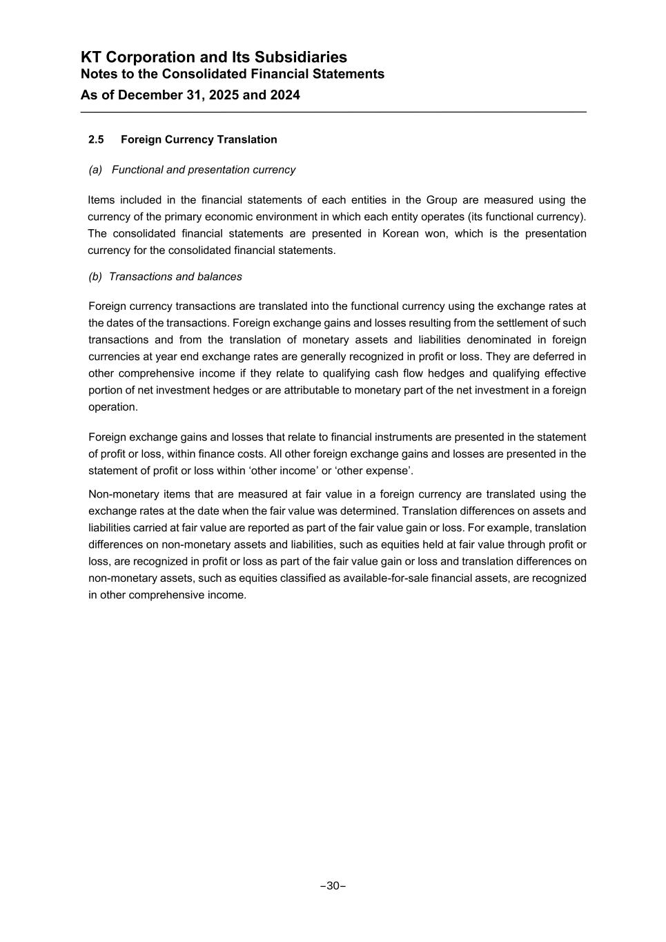 KT Corporation and Its Subsidiaries Notes to the Consolidated Financial Statements As of December 31, 2025 and 2024 2.5 Foreign Currency Translation (a) Functional and presentation currency Items included in the financial statements of each entities in the Group are measured using the currency of the primary economic environment in which each entity operates (its functional currency). The consolidated financial statements are presented in Korean won, which is the presentation currency for the consolidated financial statements. (b) Transactions and balances Foreign currency transactions are translated into the functional currency using the exchange rates at the dates of the transactions. Foreign exchange gains and losses resulting from the settlement of such transactions and from the translation of monetary assets and liabilities denominated in foreign currencies at year end exchange rates are generally recognized in profit or loss. They are deferred in other comprehensive income if they relate to qualifying cash flow hedges and qualifying effective portion of net investment hedges or are attributable to monetary part of the net investment in a foreign operation. Foreign exchange gains and losses that relate to financial instruments are presented in the statement of profit or loss, within finance costs. All other foreign exchange gains and losses are presented in the statement of profit or loss within ‘other income’ or ‘other expense’. Non-monetary items that are measured at fair value in a foreign currency are translated using the exchange rates at the date when the fair value was determined. Translation differences on assets and liabilities carried at fair value are reported as part of the fair value gain or loss. For example, translation differences on non-monetary assets and liabilities, such as equities held at fair value through profit or loss, are recognized in profit or loss as part of the fair value gain or loss and translation differences on non-monetary assets, such as equities classified as available-for-sale financial assets, are recognized in other comprehensive income. -30-