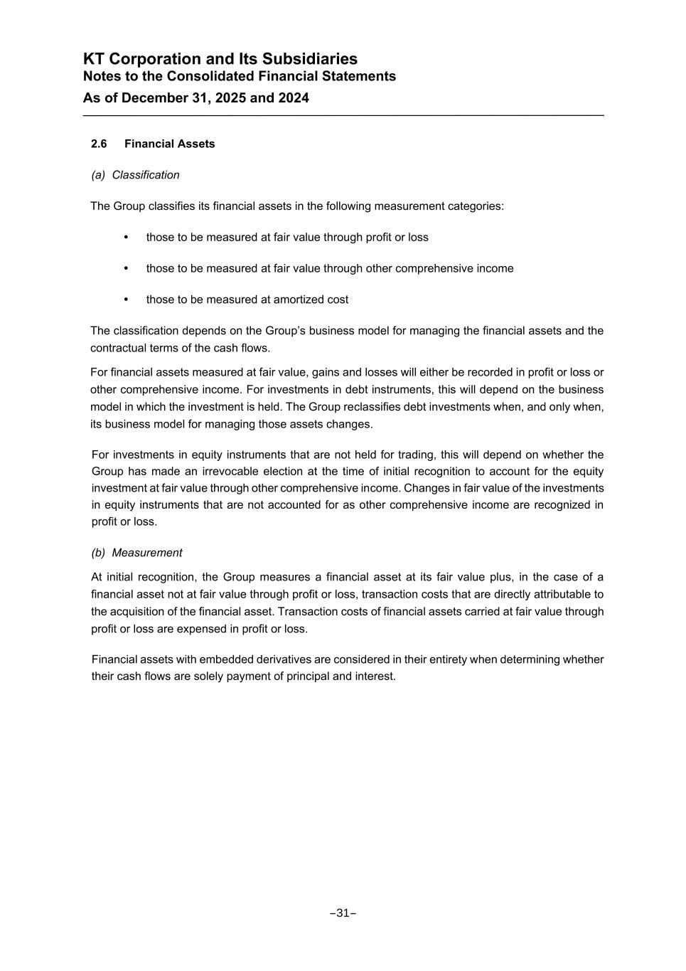 KT Corporation and Its Subsidiaries Notes to the Consolidated Financial Statements As of December 31, 2025 and 2024 2.6 Financial Assets (a) Classification The Group classifies its financial assets in the following measurement categories: those to be measured at fair value through profit or loss those to be measured at fair value through other comprehensive income those to be measured at amortized cost The classification depends on the Group’s business model for managing the financial assets and the contractual terms of the cash flows. For financial assets measured at fair value, gains and losses will either be recorded in profit or loss or other comprehensive income. For investments in debt instruments, this will depend on the business model in which the investment is held. The Group reclassifies debt investments when, and only when, its business model for managing those assets changes. For investments in equity instruments that are not held for trading, this will depend on whether the Group has made an irrevocable election at the time of initial recognition to account for the equity investment at fair value through other comprehensive income. Changes in fair value of the investments in equity instruments that are not accounted for as other comprehensive income are recognized in profit or loss. (b) Measurement At initial recognition, the Group measures a financial asset at its fair value plus, in the case of a financial asset not at fair value through profit or loss, transaction costs that are directly attributable to the acquisition of the financial asset. Transaction costs of financial assets carried at fair value through profit or loss are expensed in profit or loss. Financial assets with embedded derivatives are considered in their entirety when determining whether their cash flows are solely payment of principal and interest. -31-