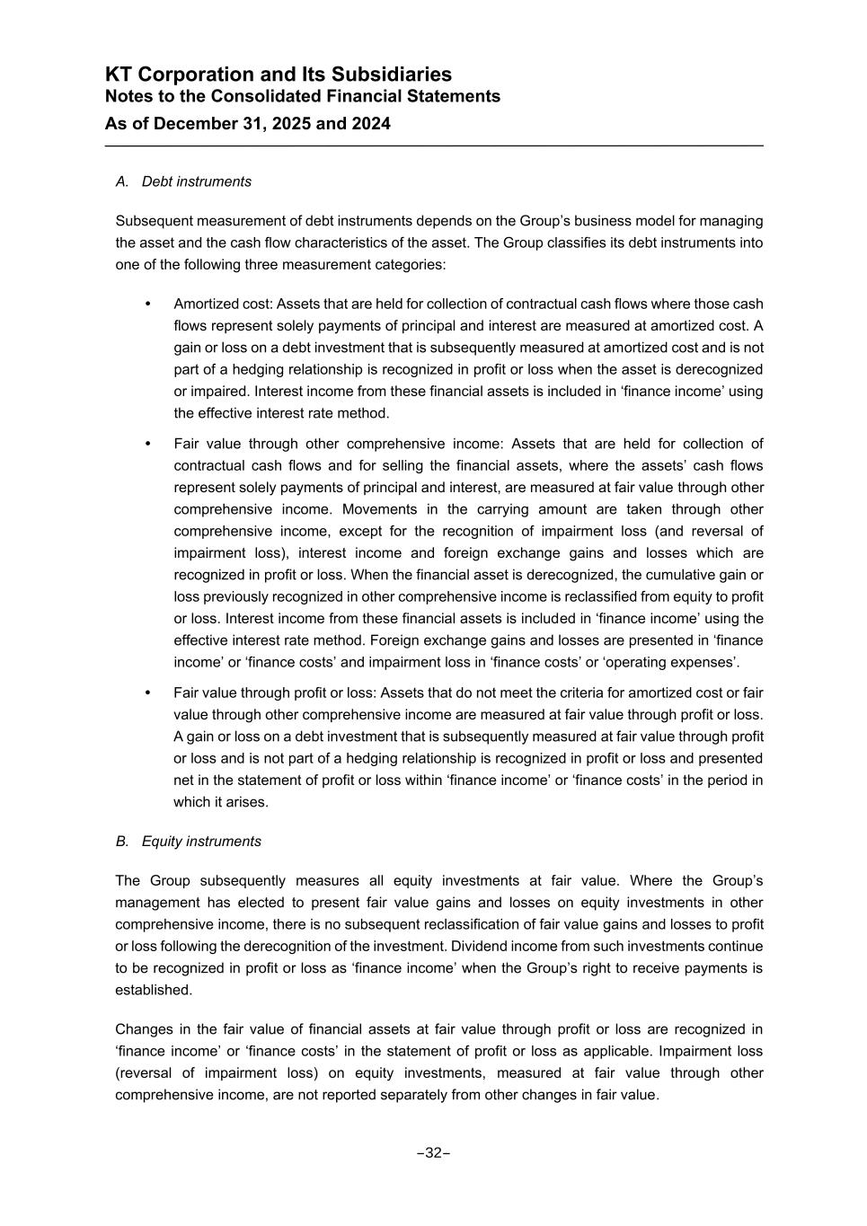 KT Corporation and Its Subsidiaries Notes to the Consolidated Financial Statements As of December 31, 2025 and 2024 A. Debt instruments Subsequent measurement of debt instruments depends on the Group’s business model for managing the asset and the cash flow characteristics of the asset. The Group classifies its debt instruments into one of the following three measurement categories: Amortized cost: Assets that are held for collection of contractual cash flows where those cash flows represent solely payments of principal and interest are measured at amortized cost. A gain or loss on a debt investment that is subsequently measured at amortized cost and is not part of a hedging relationship is recognized in profit or loss when the asset is derecognized or impaired. Interest income from these financial assets is included in ‘finance income’ using the effective interest rate method. Fair value through other comprehensive income: Assets that are held for collection of contractual cash flows and for selling the financial assets, where the assets’ cash flows represent solely payments of principal and interest, are measured at fair value through other comprehensive income. Movements in the carrying amount are taken through other comprehensive income, except for the recognition of impairment loss (and reversal of impairment loss), interest income and foreign exchange gains and losses which are recognized in profit or loss. When the financial asset is derecognized, the cumulative gain or loss previously recognized in other comprehensive income is reclassified from equity to profit or loss. Interest income from these financial assets is included in ‘finance income’ using the effective interest rate method. Foreign exchange gains and losses are presented in ‘finance income’ or ‘finance costs’ and impairment loss in ‘finance costs’ or ‘operating expenses’. Fair value through profit or loss: Assets that do not meet the criteria for amortized cost or fair value through other comprehensive income are measured at fair value through profit or loss. A gain or loss on a debt investment that is subsequently measured at fair value through profit or loss and is not part of a hedging relationship is recognized in profit or loss and presented net in the statement of profit or loss within ‘finance income’ or ‘finance costs’ in the period in which it arises. B. Equity instruments The Group subsequently measures all equity investments at fair value. Where the Group’s management has elected to present fair value gains and losses on equity investments in other comprehensive income, there is no subsequent reclassification of fair value gains and losses to profit or loss following the derecognition of the investment. Dividend income from such investments continue to be recognized in profit or loss as ‘finance income’ when the Group’s right to receive payments is established. Changes in the fair value of financial assets at fair value through profit or loss are recognized in ‘finance income’ or ‘finance costs’ in the statement of profit or loss as applicable. Impairment loss (reversal of impairment loss) on equity investments, measured at fair value through other comprehensive income, are not reported separately from other changes in fair value. -32-
