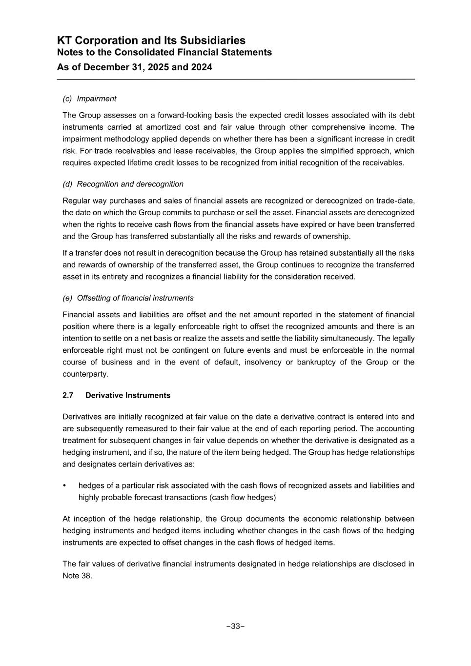 KT Corporation and Its Subsidiaries Notes to the Consolidated Financial Statements As of December 31, 2025 and 2024 (c) Impairment The Group assesses on a forward-looking basis the expected credit losses associated with its debt instruments carried at amortized cost and fair value through other comprehensive income. The impairment methodology applied depends on whether there has been a significant increase in credit risk. For trade receivables and lease receivables, the Group applies the simplified approach, which requires expected lifetime credit losses to be recognized from initial recognition of the receivables. (d) Recognition and derecognition Regular way purchases and sales of financial assets are recognized or derecognized on trade-date, the date on which the Group commits to purchase or sell the asset. Financial assets are derecognized when the rights to receive cash flows from the financial assets have expired or have been transferred and the Group has transferred substantially all the risks and rewards of ownership. If a transfer does not result in derecognition because the Group has retained substantially all the risks and rewards of ownership of the transferred asset, the Group continues to recognize the transferred asset in its entirety and recognizes a financial liability for the consideration received. (e) Offsetting of financial instruments Financial assets and liabilities are offset and the net amount reported in the statement of financial position where there is a legally enforceable right to offset the recognized amounts and there is an intention to settle on a net basis or realize the assets and settle the liability simultaneously. The legally enforceable right must not be contingent on future events and must be enforceable in the normal course of business and in the event of default, insolvency or bankruptcy of the Group or the counterparty. 2.7 Derivative Instruments Derivatives are initially recognized at fair value on the date a derivative contract is entered into and are subsequently remeasured to their fair value at the end of each reporting period. The accounting treatment for subsequent changes in fair value depends on whether the derivative is designated as a hedging instrument, and if so, the nature of the item being hedged. The Group has hedge relationships and designates certain derivatives as: hedges of a particular risk associated with the cash flows of recognized assets and liabilities and highly probable forecast transactions (cash flow hedges) At inception of the hedge relationship, the Group documents the economic relationship between hedging instruments and hedged items including whether changes in the cash flows of the hedging instruments are expected to offset changes in the cash flows of hedged items. The fair values of derivative financial instruments designated in hedge relationships are disclosed in Note 38. -33-