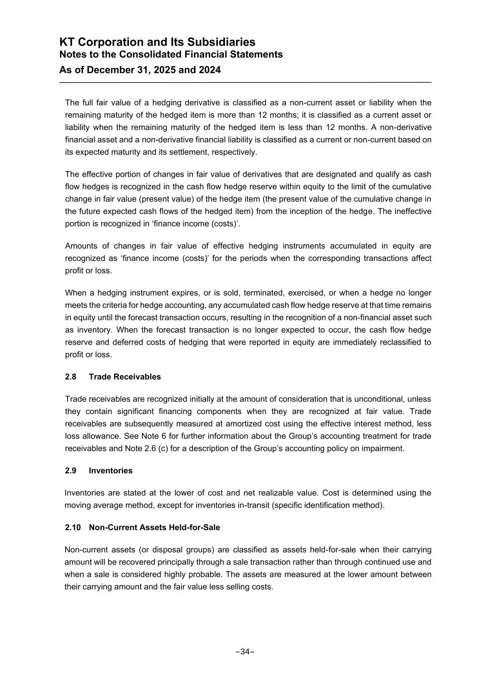 KT Corporation and Its Subsidiaries Notes to the Consolidated Financial Statements As of December 31, 2025 and 2024 The full fair value of a hedging derivative is classified as a non-current asset or liability when the remaining maturity of the hedged item is more than 12 months; it is classified as a current asset or liability when the remaining maturity of the hedged item is less than 12 months. A non-derivative financial asset and a non-derivative financial liability is classified as a current or non-current based on its expected maturity and its settlement, respectively. The effective portion of changes in fair value of derivatives that are designated and qualify as cash flow hedges is recognized in the cash flow hedge reserve within equity to the limit of the cumulative change in fair value (present value) of the hedge item (the present value of the cumulative change in the future expected cash flows of the hedged item) from the inception of the hedge. The ineffective portion is recognized in ‘finance income (costs)’. Amounts of changes in fair value of effective hedging instruments accumulated in equity are recognized as ‘finance income (costs)’ for the periods when the corresponding transactions affect profit or loss. When a hedging instrument expires, or is sold, terminated, exercised, or when a hedge no longer meets the criteria for hedge accounting, any accumulated cash flow hedge reserve at that time remains in equity until the forecast transaction occurs, resulting in the recognition of a non-financial asset such as inventory. When the forecast transaction is no longer expected to occur, the cash flow hedge reserve and deferred costs of hedging that were reported in equity are immediately reclassified to profit or loss. 2.8 Trade Receivables Trade receivables are recognized initially at the amount of consideration that is unconditional, unless they contain significant financing components when they are recognized at fair value. Trade receivables are subsequently measured at amortized cost using the effective interest method, less loss allowance. See Note 6 for further information about the Group’s accounting treatment for trade receivables and Note 2.6 (c) for a description of the Group’s accounting policy on impairment. 2.9 Inventories Inventories are stated at the lower of cost and net realizable value. Cost is determined using the moving average method, except for inventories in-transit (specific identification method). 2.10 Non-Current Assets Held-for-Sale Non-current assets (or disposal groups) are classified as assets held-for-sale when their carrying amount will be recovered principally through a sale transaction rather than through continued use and when a sale is considered highly probable. The assets are measured at the lower amount between their carrying amount and the fair value less selling costs. -34-