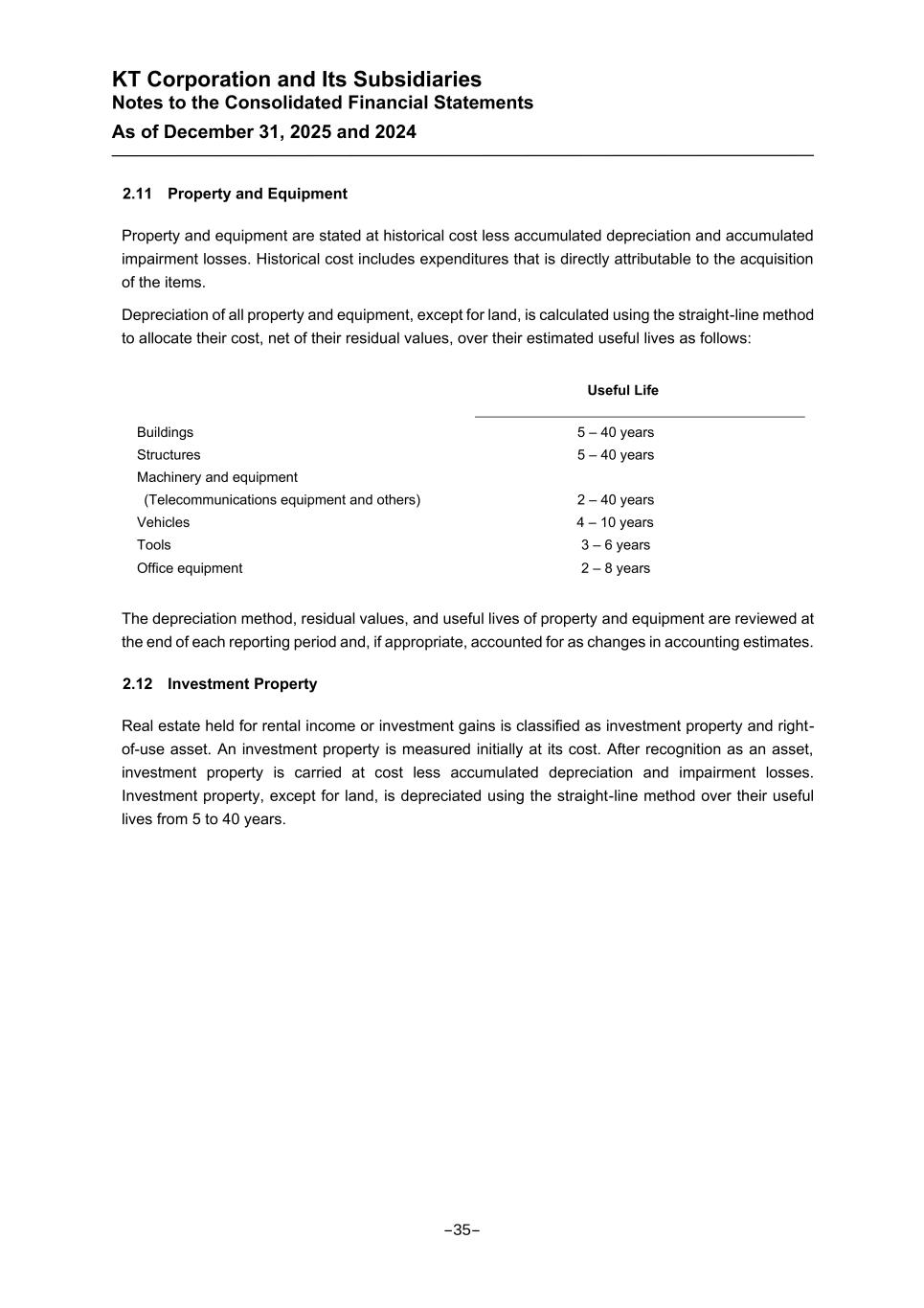 KT Corporation and Its Subsidiaries Notes to the Consolidated Financial Statements As of December 31, 2025 and 2024 2.11 Property and Equipment Property and equipment are stated at historical cost less accumulated depreciation and accumulated impairment losses. Historical cost includes expenditures that is directly attributable to the acquisition of the items. Depreciation of all property and equipment, except for land, is calculated using the straight-line method to allocate their cost, net of their residual values, over their estimated useful lives as follows: Useful Life Buildings 5 – 40 years Structures 5 – 40 years Machinery and equipment (Telecommunications equipment and others) 2 – 40 years Vehicles 4 – 10 years Tools 3 – 6 years Office equipment 2 – 8 years The depreciation method, residual values, and useful lives of property and equipment are reviewed at the end of each reporting period and, if appropriate, accounted for as changes in accounting estimates. 2.12 Investment Property Real estate held for rental income or investment gains is classified as investment property and right- of-use asset. An investment property is measured initially at its cost. After recognition as an asset, investment property is carried at cost less accumulated depreciation and impairment losses. Investment property, except for land, is depreciated using the straight-line method over their useful lives from 5 to 40 years. -35-