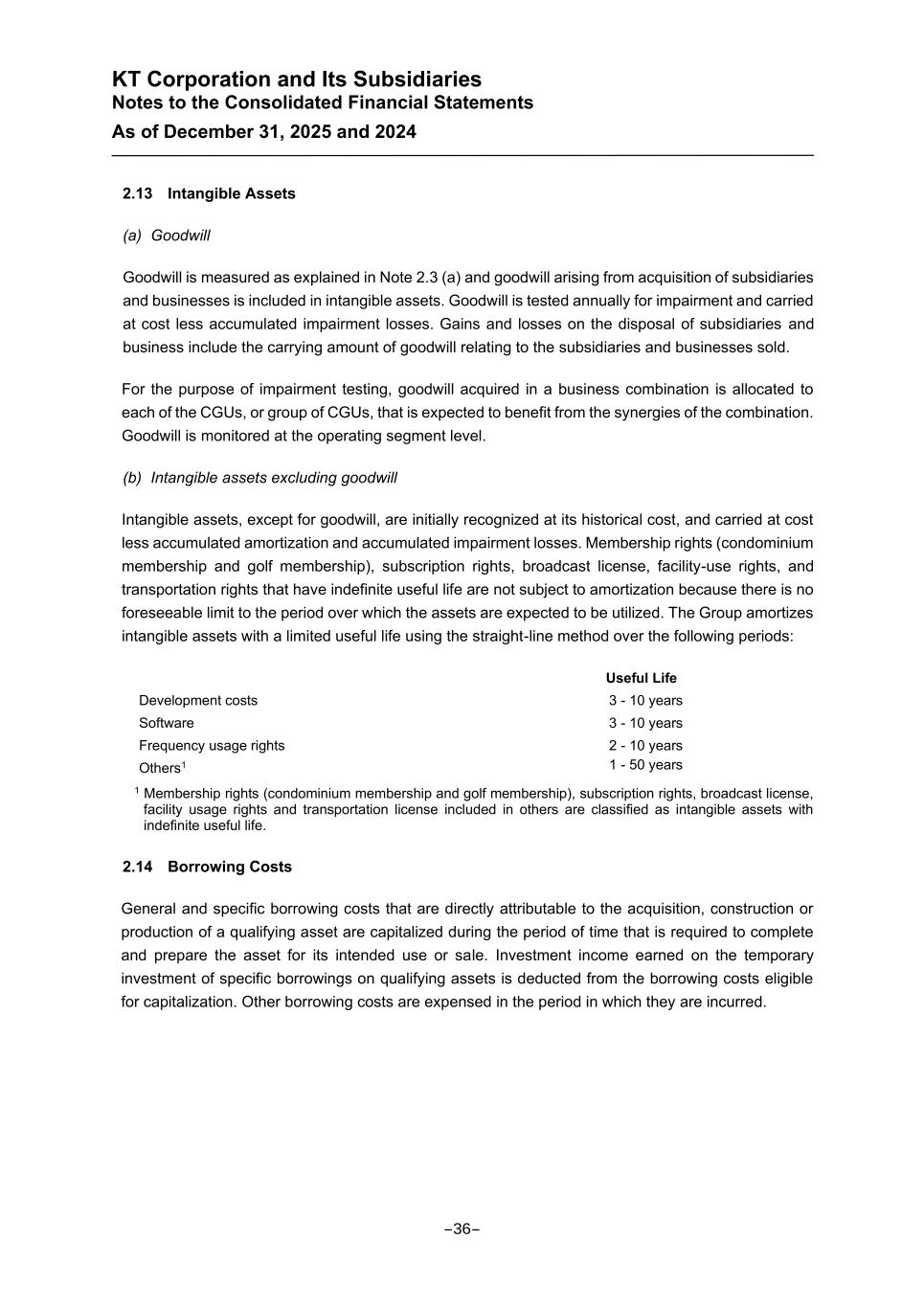 KT Corporation and Its Subsidiaries Notes to the Consolidated Financial Statements As of December 31, 2025 and 2024 2.13 Intangible Assets (a) Goodwill Goodwill is measured as explained in Note 2.3 (a) and goodwill arising from acquisition of subsidiaries and businesses is included in intangible assets. Goodwill is tested annually for impairment and carried at cost less accumulated impairment losses. Gains and losses on the disposal of subsidiaries and business include the carrying amount of goodwill relating to the subsidiaries and businesses sold. For the purpose of impairment testing, goodwill acquired in a business combination is allocated to each of the CGUs, or group of CGUs, that is expected to benefit from the synergies of the combination. Goodwill is monitored at the operating segment level. (b) Intangible assets excluding goodwill Intangible assets, except for goodwill, are initially recognized at its historical cost, and carried at cost less accumulated amortization and accumulated impairment losses. Membership rights (condominium membership and golf membership), subscription rights, broadcast license, facility-use rights, and transportation rights that have indefinite useful life are not subject to amortization because there is no foreseeable limit to the period over which the assets are expected to be utilized. The Group amortizes intangible assets with a limited useful life using the straight-line method over the following periods: Useful Life Development costs 3 - 10 years Software 3 - 10 years Frequency usage rights 2 - 10 years Others1 1 - 50 years 1 Membership rights (condominium membership and golf membership), subscription rights, broadcast license, facility usage rights and transportation license included in others are classified as intangible assets with indefinite useful life. 2.14 Borrowing Costs General and specific borrowing costs that are directly attributable to the acquisition, construction or production of a qualifying asset are capitalized during the period of time that is required to complete and prepare the asset for its intended use or sale. Investment income earned on the temporary investment of specific borrowings on qualifying assets is deducted from the borrowing costs eligible for capitalization. Other borrowing costs are expensed in the period in which they are incurred. -36-