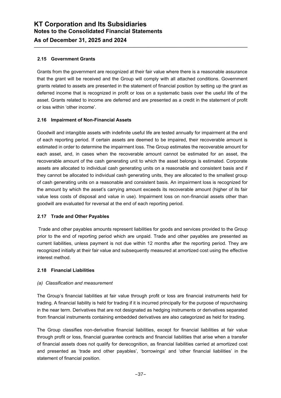 KT Corporation and Its Subsidiaries Notes to the Consolidated Financial Statements As of December 31, 2025 and 2024 2.15 Government Grants Grants from the government are recognized at their fair value where there is a reasonable assurance that the grant will be received and the Group will comply with all attached conditions. Government grants related to assets are presented in the statement of financial position by setting up the grant as deferred income that is recognized in profit or loss on a systematic basis over the useful life of the asset. Grants related to income are deferred and are presented as a credit in the statement of profit or loss within ‘other income’. 2.16 Impairment of Non-Financial Assets Goodwill and intangible assets with indefinite useful life are tested annually for impairment at the end of each reporting period. If certain assets are deemed to be impaired, their recoverable amount is estimated in order to determine the impairment loss. The Group estimates the recoverable amount for each asset, and, in cases when the recoverable amount cannot be estimated for an asset, the recoverable amount of the cash generating unit to which the asset belongs is estimated. Corporate assets are allocated to individual cash generating units on a reasonable and consistent basis and if they cannot be allocated to individual cash generating units, they are allocated to the smallest group of cash generating units on a reasonable and consistent basis. An impairment loss is recognized for the amount by which the asset’s carrying amount exceeds its recoverable amount (higher of its fair value less costs of disposal and value in use). Impairment loss on non-financial assets other than goodwill are evaluated for reversal at the end of each reporting period. 2.17 Trade and Other Payables Trade and other payables amounts represent liabilities for goods and services provided to the Group prior to the end of reporting period which are unpaid. Trade and other payables are presented as current liabilities, unless payment is not due within 12 months after the reporting period. They are recognized initially at their fair value and subsequently measured at amortized cost using the effective interest method. 2.18 Financial Liabilities (a) Classification and measurement The Group’s financial liabilities at fair value through profit or loss are financial instruments held for trading. A financial liability is held for trading if it is incurred principally for the purpose of repurchasing in the near term. Derivatives that are not designated as hedging instruments or derivatives separated from financial instruments containing embedded derivatives are also categorized as held for trading. The Group classifies non-derivative financial liabilities, except for financial liabilities at fair value through profit or loss, financial guarantee contracts and financial liabilities that arise when a transfer of financial assets does not qualify for derecognition, as financial liabilities carried at amortized cost and presented as ‘trade and other payables’, ‘borrowings’ and ‘other financial liabilities’ in the statement of financial position. -37-