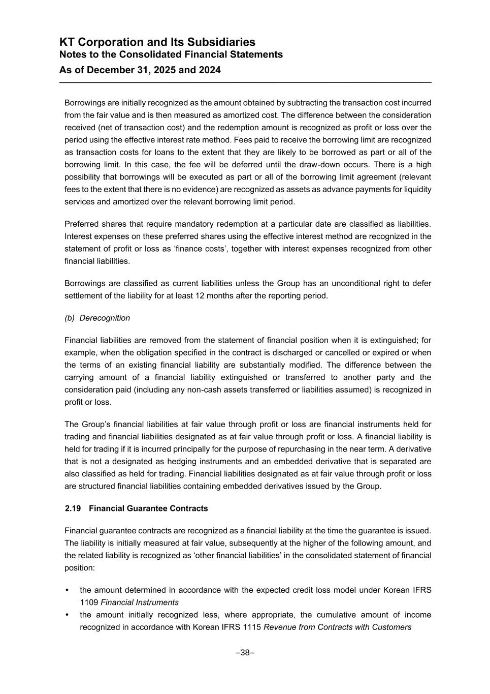 KT Corporation and Its Subsidiaries Notes to the Consolidated Financial Statements As of December 31, 2025 and 2024 Borrowings are initially recognized as the amount obtained by subtracting the transaction cost incurred from the fair value and is then measured as amortized cost. The difference between the consideration received (net of transaction cost) and the redemption amount is recognized as profit or loss over the period using the effective interest rate method. Fees paid to receive the borrowing limit are recognized as transaction costs for loans to the extent that they are likely to be borrowed as part or all of the borrowing limit. In this case, the fee will be deferred until the draw-down occurs. There is a high possibility that borrowings will be executed as part or all of the borrowing limit agreement (relevant fees to the extent that there is no evidence) are recognized as assets as advance payments for liquidity services and amortized over the relevant borrowing limit period. Preferred shares that require mandatory redemption at a particular date are classified as liabilities. Interest expenses on these preferred shares using the effective interest method are recognized in the statement of profit or loss as ‘finance costs’, together with interest expenses recognized from other financial liabilities. Borrowings are classified as current liabilities unless the Group has an unconditional right to defer settlement of the liability for at least 12 months after the reporting period. (b) Derecognition Financial liabilities are removed from the statement of financial position when it is extinguished; for example, when the obligation specified in the contract is discharged or cancelled or expired or when the terms of an existing financial liability are substantially modified. The difference between the carrying amount of a financial liability extinguished or transferred to another party and the consideration paid (including any non-cash assets transferred or liabilities assumed) is recognized in profit or loss. The Group’s financial liabilities at fair value through profit or loss are financial instruments held for trading and financial liabilities designated as at fair value through profit or loss. A financial liability is held for trading if it is incurred principally for the purpose of repurchasing in the near term. A derivative that is not a designated as hedging instruments and an embedded derivative that is separated are also classified as held for trading. Financial liabilities designated as at fair value through profit or loss are structured financial liabilities containing embedded derivatives issued by the Group. 2.19 Financial Guarantee Contracts Financial guarantee contracts are recognized as a financial liability at the time the guarantee is issued. The liability is initially measured at fair value, subsequently at the higher of the following amount, and the related liability is recognized as ‘other financial liabilities’ in the consolidated statement of financial position: the amount determined in accordance with the expected credit loss model under Korean IFRS 1109 Financial Instruments the amount initially recognized less, where appropriate, the cumulative amount of income recognized in accordance with Korean IFRS 1115 Revenue from Contracts with Customers -38-