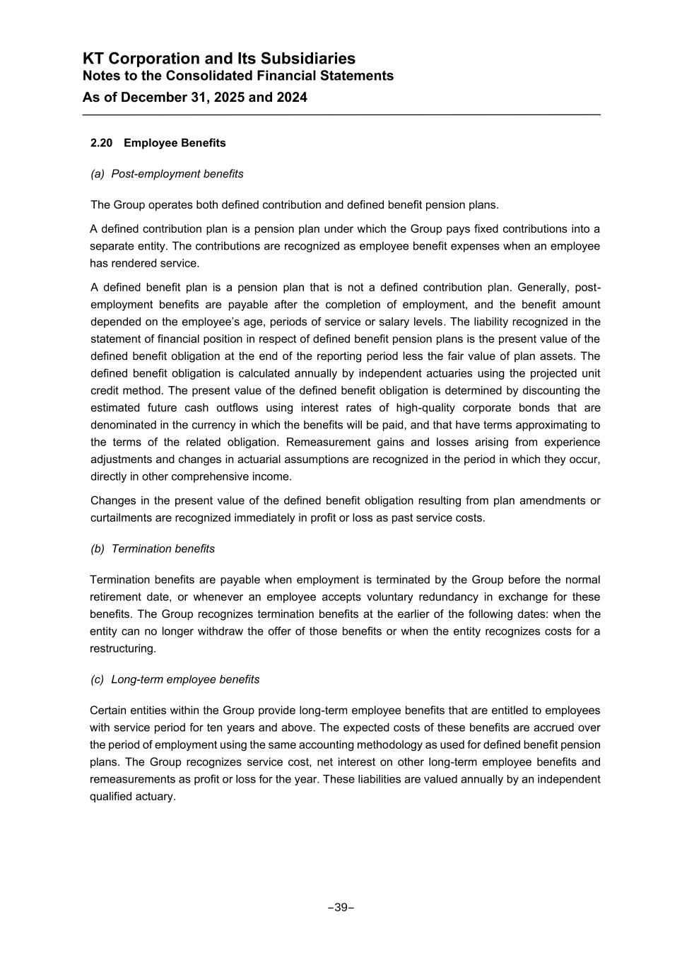 KT Corporation and Its Subsidiaries Notes to the Consolidated Financial Statements As of December 31, 2025 and 2024 2.20 Employee Benefits (a) Post-employment benefits The Group operates both defined contribution and defined benefit pension plans. A defined contribution plan is a pension plan under which the Group pays fixed contributions into a separate entity. The contributions are recognized as employee benefit expenses when an employee has rendered service. A defined benefit plan is a pension plan that is not a defined contribution plan. Generally, post- employment benefits are payable after the completion of employment, and the benefit amount depended on the employee’s age, periods of service or salary levels. The liability recognized in the statement of financial position in respect of defined benefit pension plans is the present value of the defined benefit obligation at the end of the reporting period less the fair value of plan assets. The defined benefit obligation is calculated annually by independent actuaries using the projected unit credit method. The present value of the defined benefit obligation is determined by discounting the estimated future cash outflows using interest rates of high-quality corporate bonds that are denominated in the currency in which the benefits will be paid, and that have terms approximating to the terms of the related obligation. Remeasurement gains and losses arising from experience adjustments and changes in actuarial assumptions are recognized in the period in which they occur, directly in other comprehensive income. Changes in the present value of the defined benefit obligation resulting from plan amendments or curtailments are recognized immediately in profit or loss as past service costs. (b) Termination benefits Termination benefits are payable when employment is terminated by the Group before the normal retirement date, or whenever an employee accepts voluntary redundancy in exchange for these benefits. The Group recognizes termination benefits at the earlier of the following dates: when the entity can no longer withdraw the offer of those benefits or when the entity recognizes costs for a restructuring. (c) Long-term employee benefits Certain entities within the Group provide long-term employee benefits that are entitled to employees with service period for ten years and above. The expected costs of these benefits are accrued over the period of employment using the same accounting methodology as used for defined benefit pension plans. The Group recognizes service cost, net interest on other long-term employee benefits and remeasurements as profit or loss for the year. These liabilities are valued annually by an independent qualified actuary. -39-