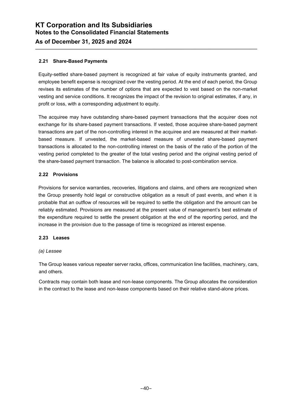 KT Corporation and Its Subsidiaries Notes to the Consolidated Financial Statements As of December 31, 2025 and 2024 2.21 Share-Based Payments Equity-settled share-based payment is recognized at fair value of equity instruments granted, and employee benefit expense is recognized over the vesting period. At the end of each period, the Group revises its estimates of the number of options that are expected to vest based on the non-market vesting and service conditions. It recognizes the impact of the revision to original estimates, if any, in profit or loss, with a corresponding adjustment to equity. The acquiree may have outstanding share-based payment transactions that the acquirer does not exchange for its share-based payment transactions. If vested, those acquiree share-based payment transactions are part of the non-controlling interest in the acquiree and are measured at their market- based measure. If unvested, the market-based measure of unvested share-based payment transactions is allocated to the non-controlling interest on the basis of the ratio of the portion of the vesting period completed to the greater of the total vesting period and the original vesting period of the share-based payment transaction. The balance is allocated to post-combination service. 2.22 Provisions Provisions for service warranties, recoveries, litigations and claims, and others are recognized when the Group presently hold legal or constructive obligation as a result of past events, and when it is probable that an outflow of resources will be required to settle the obligation and the amount can be reliably estimated. Provisions are measured at the present value of management’s best estimate of the expenditure required to settle the present obligation at the end of the reporting period, and the increase in the provision due to the passage of time is recognized as interest expense. 2.23 Leases (a) Lessee The Group leases various repeater server racks, offices, communication line facilities, machinery, cars, and others. Contracts may contain both lease and non-lease components. The Group allocates the consideration in the contract to the lease and non-lease components based on their relative stand-alone prices. -40-
