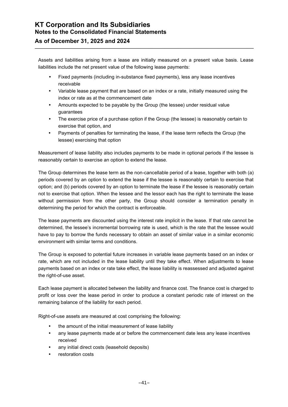 KT Corporation and Its Subsidiaries Notes to the Consolidated Financial Statements As of December 31, 2025 and 2024 Assets and liabilities arising from a lease are initially measured on a present value basis. Lease liabilities include the net present value of the following lease payments: Fixed payments (including in-substance fixed payments), less any lease incentives receivable Variable lease payment that are based on an index or a rate, initially measured using the index or rate as at the commencement date Amounts expected to be payable by the Group (the lessee) under residual value guarantees The exercise price of a purchase option if the Group (the lessee) is reasonably certain to exercise that option, and Payments of penalties for terminating the lease, if the lease term reflects the Group (the lessee) exercising that option Measurement of lease liability also includes payments to be made in optional periods if the lessee is reasonably certain to exercise an option to extend the lease. The Group determines the lease term as the non-cancellable period of a lease, together with both (a) periods covered by an option to extend the lease if the lessee is reasonably certain to exercise that option; and (b) periods covered by an option to terminate the lease if the lessee is reasonably certain not to exercise that option. When the lessee and the lessor each has the right to terminate the lease without permission from the other party, the Group should consider a termination penalty in determining the period for which the contract is enforceable. The lease payments are discounted using the interest rate implicit in the lease. If that rate cannot be determined, the lessee’s incremental borrowing rate is used, which is the rate that the lessee would have to pay to borrow the funds necessary to obtain an asset of similar value in a similar economic environment with similar terms and conditions. The Group is exposed to potential future increases in variable lease payments based on an index or rate, which are not included in the lease liability until they take effect. When adjustments to lease payments based on an index or rate take effect, the lease liability is reassessed and adjusted against the right-of-use asset. Each lease payment is allocated between the liability and finance cost. The finance cost is charged to profit or loss over the lease period in order to produce a constant periodic rate of interest on the remaining balance of the liability for each period. Right-of-use assets are measured at cost comprising the following: the amount of the initial measurement of lease liability any lease payments made at or before the commencement date less any lease incentives received any initial direct costs (leasehold deposits) restoration costs -41-