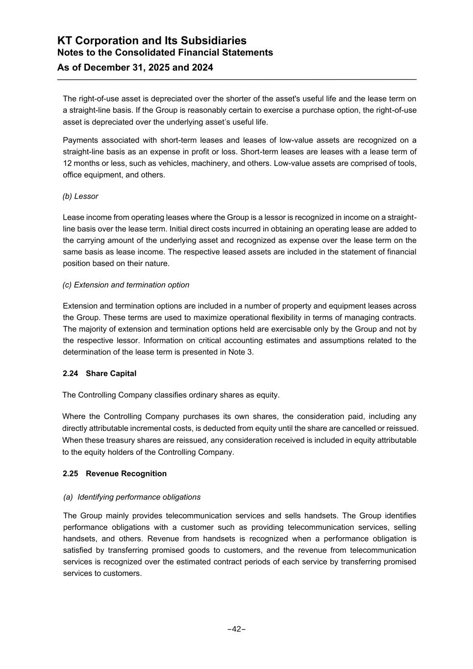KT Corporation and Its Subsidiaries Notes to the Consolidated Financial Statements As of December 31, 2025 and 2024 The right-of-use asset is depreciated over the shorter of the asset's useful life and the lease term on a straight-line basis. If the Group is reasonably certain to exercise a purchase option, the right-of-use asset is depreciated over the underlying asset’s useful life. Payments associated with short-term leases and leases of low-value assets are recognized on a straight-line basis as an expense in profit or loss. Short-term leases are leases with a lease term of 12 months or less, such as vehicles, machinery, and others. Low-value assets are comprised of tools, office equipment, and others. (b) Lessor Lease income from operating leases where the Group is a lessor is recognized in income on a straight- line basis over the lease term. Initial direct costs incurred in obtaining an operating lease are added to the carrying amount of the underlying asset and recognized as expense over the lease term on the same basis as lease income. The respective leased assets are included in the statement of financial position based on their nature. (c) Extension and termination option Extension and termination options are included in a number of property and equipment leases across the Group. These terms are used to maximize operational flexibility in terms of managing contracts. The majority of extension and termination options held are exercisable only by the Group and not by the respective lessor. Information on critical accounting estimates and assumptions related to the determination of the lease term is presented in Note 3. 2.24 Share Capital The Controlling Company classifies ordinary shares as equity. Where the Controlling Company purchases its own shares, the consideration paid, including any directly attributable incremental costs, is deducted from equity until the share are cancelled or reissued. When these treasury shares are reissued, any consideration received is included in equity attributable to the equity holders of the Controlling Company. 2.25 Revenue Recognition (a) Identifying performance obligations The Group mainly provides telecommunication services and sells handsets. The Group identifies performance obligations with a customer such as providing telecommunication services, selling handsets, and others. Revenue from handsets is recognized when a performance obligation is satisfied by transferring promised goods to customers, and the revenue from telecommunication services is recognized over the estimated contract periods of each service by transferring promised services to customers. -42-