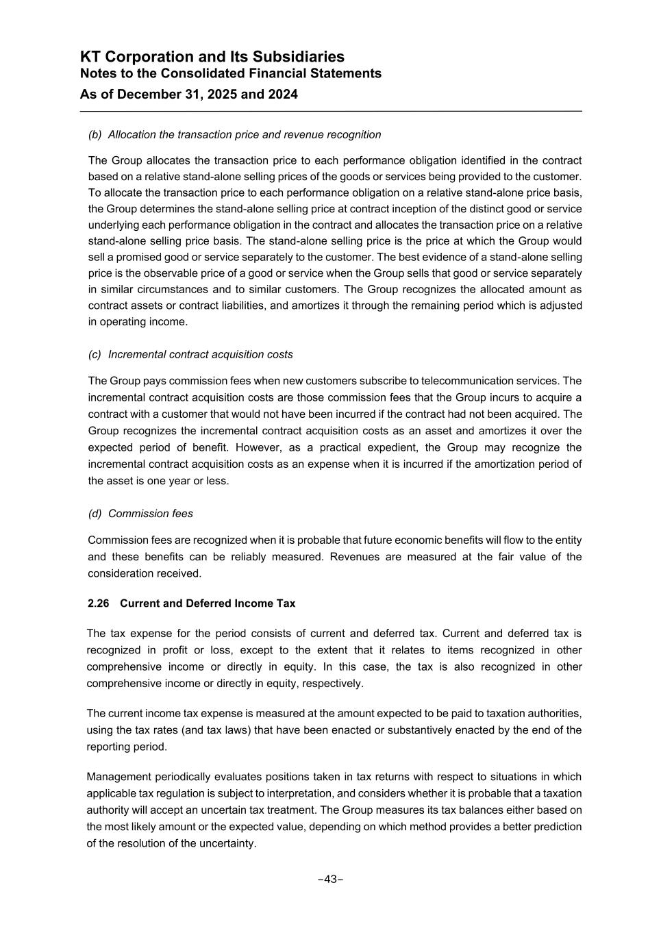 KT Corporation and Its Subsidiaries Notes to the Consolidated Financial Statements As of December 31, 2025 and 2024 (b) Allocation the transaction price and revenue recognition The Group allocates the transaction price to each performance obligation identified in the contract based on a relative stand-alone selling prices of the goods or services being provided to the customer. To allocate the transaction price to each performance obligation on a relative stand-alone price basis, the Group determines the stand-alone selling price at contract inception of the distinct good or service underlying each performance obligation in the contract and allocates the transaction price on a relative stand-alone selling price basis. The stand-alone selling price is the price at which the Group would sell a promised good or service separately to the customer. The best evidence of a stand-alone selling price is the observable price of a good or service when the Group sells that good or service separately in similar circumstances and to similar customers. The Group recognizes the allocated amount as contract assets or contract liabilities, and amortizes it through the remaining period which is adjusted in operating income. (c) Incremental contract acquisition costs The Group pays commission fees when new customers subscribe to telecommunication services. The incremental contract acquisition costs are those commission fees that the Group incurs to acquire a contract with a customer that would not have been incurred if the contract had not been acquired. The Group recognizes the incremental contract acquisition costs as an asset and amortizes it over the expected period of benefit. However, as a practical expedient, the Group may recognize the incremental contract acquisition costs as an expense when it is incurred if the amortization period of the asset is one year or less. (d) Commission fees Commission fees are recognized when it is probable that future economic benefits will flow to the entity and these benefits can be reliably measured. Revenues are measured at the fair value of the consideration received. 2.26 Current and Deferred Income Tax The tax expense for the period consists of current and deferred tax. Current and deferred tax is recognized in profit or loss, except to the extent that it relates to items recognized in other comprehensive income or directly in equity. In this case, the tax is also recognized in other comprehensive income or directly in equity, respectively. The current income tax expense is measured at the amount expected to be paid to taxation authorities, using the tax rates (and tax laws) that have been enacted or substantively enacted by the end of the reporting period. Management periodically evaluates positions taken in tax returns with respect to situations in which applicable tax regulation is subject to interpretation, and considers whether it is probable that a taxation authority will accept an uncertain tax treatment. The Group measures its tax balances either based on the most likely amount or the expected value, depending on which method provides a better prediction of the resolution of the uncertainty. -43-