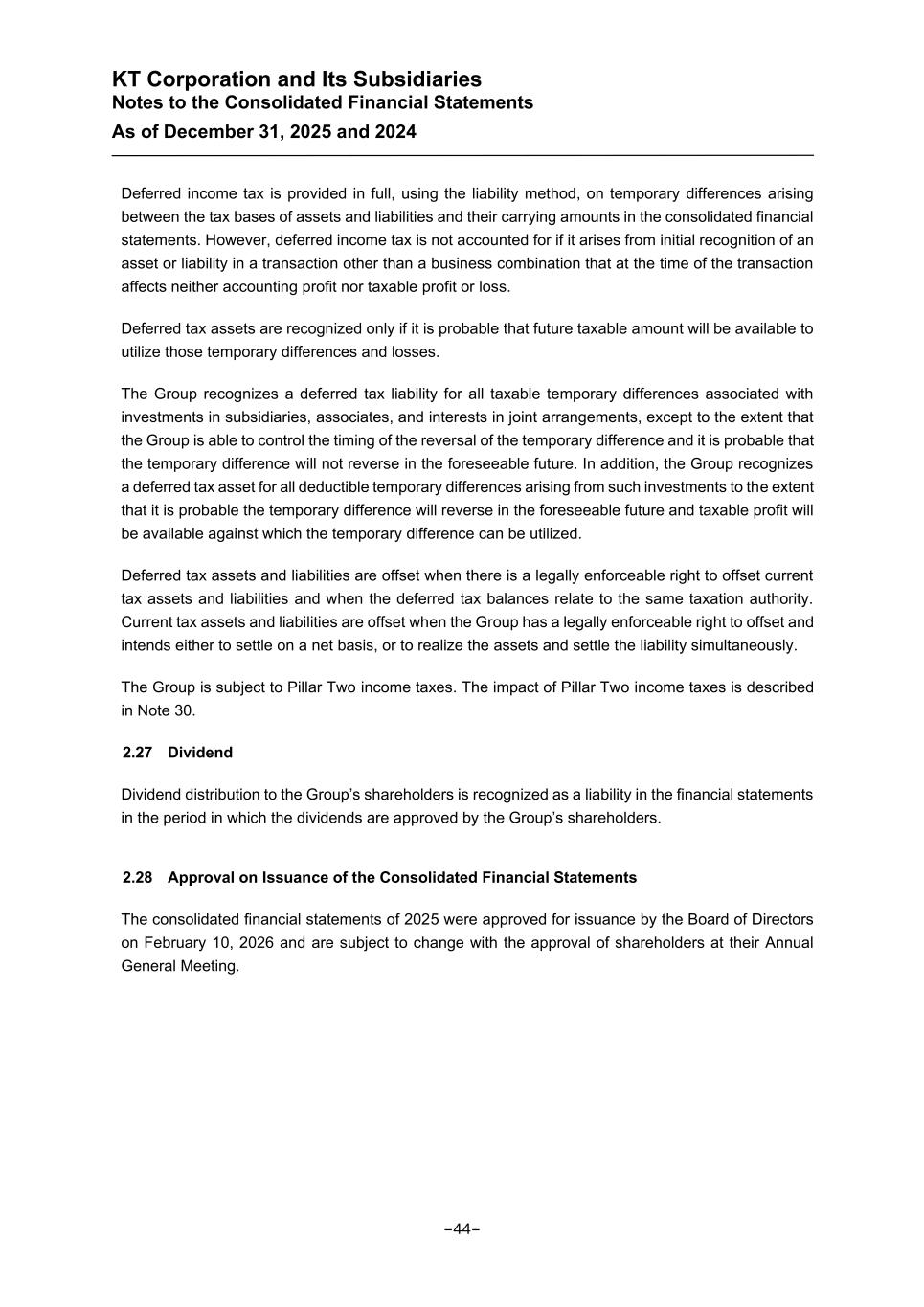 KT Corporation and Its Subsidiaries Notes to the Consolidated Financial Statements As of December 31, 2025 and 2024 Deferred income tax is provided in full, using the liability method, on temporary differences arising between the tax bases of assets and liabilities and their carrying amounts in the consolidated financial statements. However, deferred income tax is not accounted for if it arises from initial recognition of an asset or liability in a transaction other than a business combination that at the time of the transaction affects neither accounting profit nor taxable profit or loss. Deferred tax assets are recognized only if it is probable that future taxable amount will be available to utilize those temporary differences and losses. The Group recognizes a deferred tax liability for all taxable temporary differences associated with investments in subsidiaries, associates, and interests in joint arrangements, except to the extent that the Group is able to control the timing of the reversal of the temporary difference and it is probable that the temporary difference will not reverse in the foreseeable future. In addition, the Group recognizes a deferred tax asset for all deductible temporary differences arising from such investments to the extent that it is probable the temporary difference will reverse in the foreseeable future and taxable profit will be available against which the temporary difference can be utilized. Deferred tax assets and liabilities are offset when there is a legally enforceable right to offset current tax assets and liabilities and when the deferred tax balances relate to the same taxation authority. Current tax assets and liabilities are offset when the Group has a legally enforceable right to offset and intends either to settle on a net basis, or to realize the assets and settle the liability simultaneously. The Group is subject to Pillar Two income taxes. The impact of Pillar Two income taxes is described in Note 30. 2.27 Dividend Dividend distribution to the Group’s shareholders is recognized as a liability in the financial statements in the period in which the dividends are approved by the Group’s shareholders. 2.28 Approval on Issuance of the Consolidated Financial Statements The consolidated financial statements of 2025 were approved for issuance by the Board of Directors on February 10, 2026 and are subject to change with the approval of shareholders at their Annual General Meeting. -44-