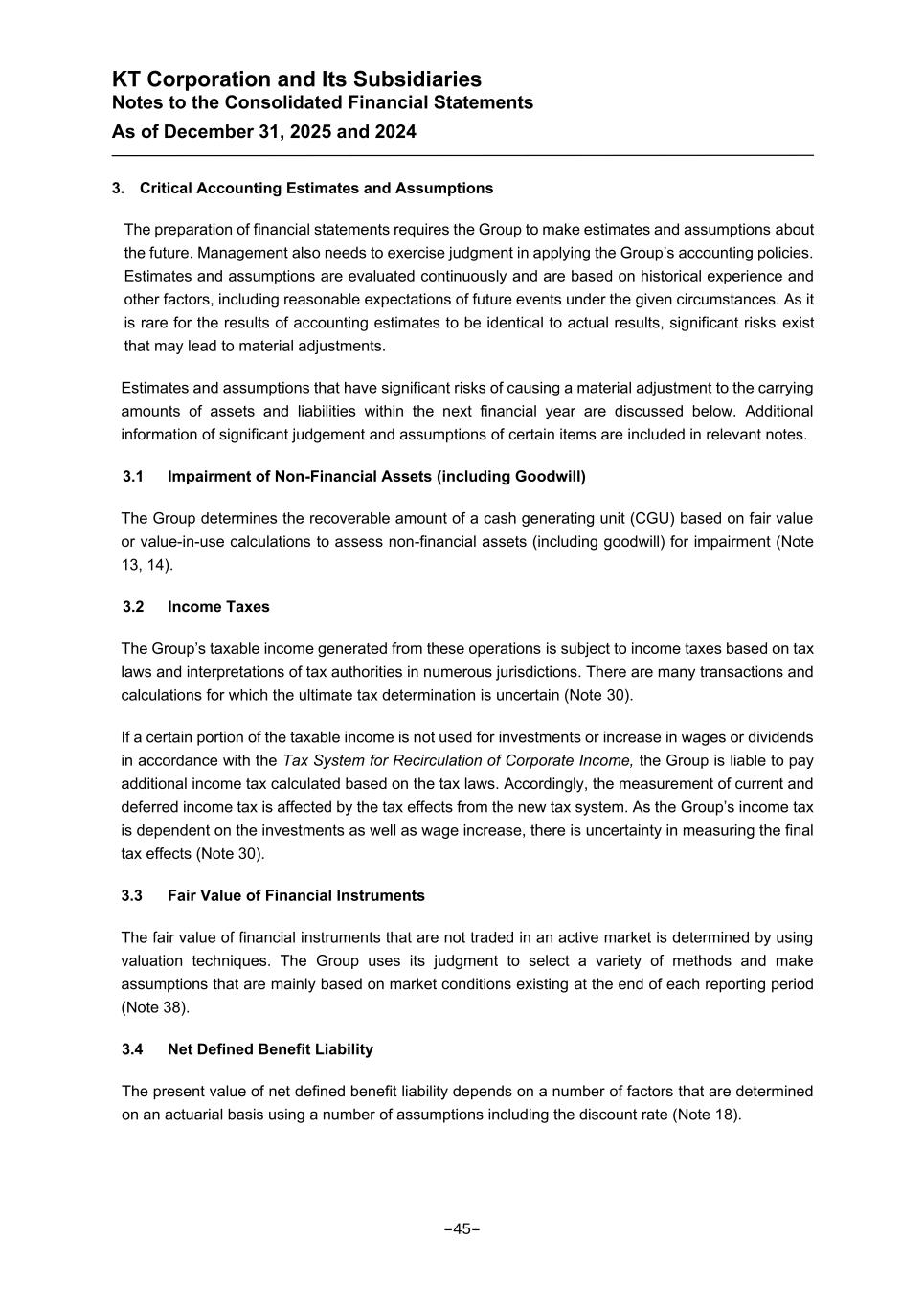 KT Corporation and Its Subsidiaries Notes to the Consolidated Financial Statements As of December 31, 2025 and 2024 3. Critical Accounting Estimates and Assumptions The preparation of financial statements requires the Group to make estimates and assumptions about the future. Management also needs to exercise judgment in applying the Group’s accounting policies. Estimates and assumptions are evaluated continuously and are based on historical experience and other factors, including reasonable expectations of future events under the given circumstances. As it is rare for the results of accounting estimates to be identical to actual results, significant risks exist that may lead to material adjustments. Estimates and assumptions that have significant risks of causing a material adjustment to the carrying amounts of assets and liabilities within the next financial year are discussed below. Additional information of significant judgement and assumptions of certain items are included in relevant notes. 3.1 Impairment of Non-Financial Assets (including Goodwill) The Group determines the recoverable amount of a cash generating unit (CGU) based on fair value or value-in-use calculations to assess non-financial assets (including goodwill) for impairment (Note 13, 14). 3.2 Income Taxes The Group’s taxable income generated from these operations is subject to income taxes based on tax laws and interpretations of tax authorities in numerous jurisdictions. There are many transactions and calculations for which the ultimate tax determination is uncertain (Note 30). If a certain portion of the taxable income is not used for investments or increase in wages or dividends in accordance with the Tax System for Recirculation of Corporate Income, the Group is liable to pay additional income tax calculated based on the tax laws. Accordingly, the measurement of current and deferred income tax is affected by the tax effects from the new tax system. As the Group’s income tax is dependent on the investments as well as wage increase, there is uncertainty in measuring the final tax effects (Note 30). 3.3 Fair Value of Financial Instruments The fair value of financial instruments that are not traded in an active market is determined by using valuation techniques. The Group uses its judgment to select a variety of methods and make assumptions that are mainly based on market conditions existing at the end of each reporting period (Note 38). 3.4 Net Defined Benefit Liability The present value of net defined benefit liability depends on a number of factors that are determined on an actuarial basis using a number of assumptions including the discount rate (Note 18). -45-