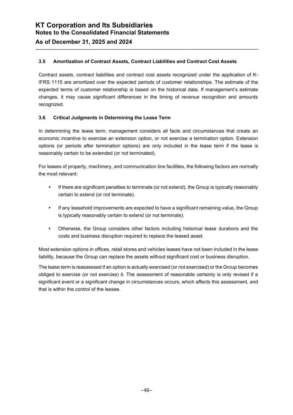 KT Corporation and Its Subsidiaries Notes to the Consolidated Financial Statements As of December 31, 2025 and 2024 3.5 Amortization of Contract Assets, Contract Liabilities and Contract Cost Assets Contract assets, contract liabilities and contract cost assets recognized under the application of K- IFRS 1115 are amortized over the expected periods of customer relationships. The estimate of the expected terms of customer relationship is based on the historical data. If management’s estimate changes, it may cause significant differences in the timing of revenue recognition and amounts recognized. 3.6 Critical Judgments in Determining the Lease Term In determining the lease term, management considers all facts and circumstances that create an economic incentive to exercise an extension option, or not exercise a termination option. Extension options (or periods after termination options) are only included in the lease term if the lease is reasonably certain to be extended (or not terminated). For leases of property, machinery, and communication line facilities, the following factors are normally the most relevant: If there are significant penalties to terminate (or not extend), the Group is typically reasonably certain to extend (or not terminate). If any leasehold improvements are expected to have a significant remaining value, the Group is typically reasonably certain to extend (or not terminate). Otherwise, the Group considers other factors including historical lease durations and the costs and business disruption required to replace the leased asset. Most extension options in offices, retail stores and vehicles leases have not been included in the lease liability, because the Group can replace the assets without significant cost or business disruption. The lease term is reassessed if an option is actually exercised (or not exercised) or the Group becomes obliged to exercise (or not exercise) it. The assessment of reasonable certainty is only revised if a significant event or a significant change in circumstances occurs, which affects this assessment, and that is within the control of the lessee. -46-