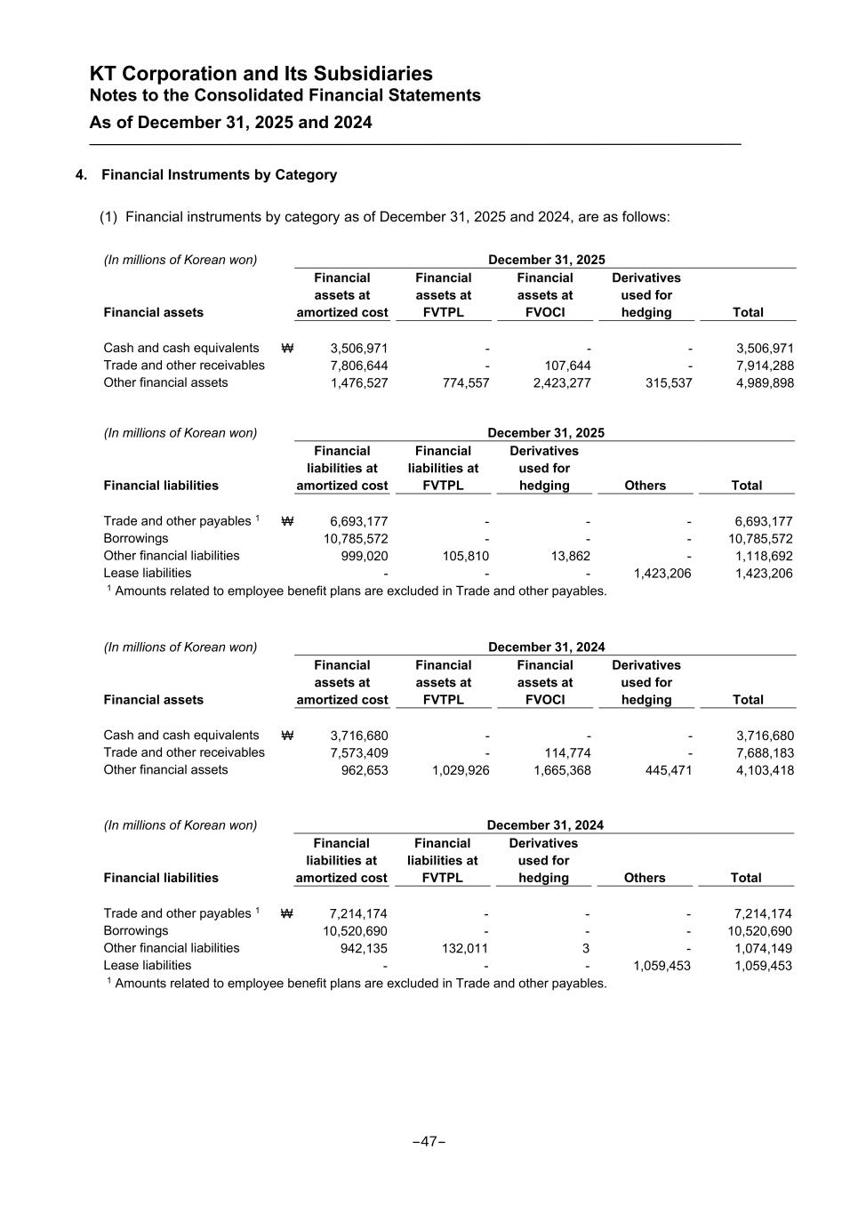 KT Corporation and Its Subsidiaries Notes to the Consolidated Financial Statements As of December 31, 2025 and 2024 4. Financial Instruments by Category (1) Financial instruments by category as of December 31, 2025 and 2024, are as follows: (In millions of Korean won) December 31, 2025 Financial assets Financial assets at amortized cost Financial assets at FVTPL Financial assets at FVOCI Derivatives used for hedging Total Cash and cash equivalents ₩ 3,506,971 - - - 3,506,971 Trade and other receivables 7,806,644 - 107,644 - 7,914,288 Other financial assets 1,476,527 774,557 2,423,277 315,537 4,989,898 (In millions of Korean won) December 31, 2025 Financial liabilities Financial liabilities at amortized cost Financial liabilities at FVTPL Derivatives used for hedging Others Total Trade and other payables 1 ₩ 6,693,177 - - - 6,693,177 Borrowings 10,785,572 - - - 10,785,572 Other financial liabilities 999,020 105,810 13,862 - 1,118,692 Lease liabilities - - - 1,423,206 1,423,206 1 Amounts related to employee benefit plans are excluded in Trade and other payables. (In millions of Korean won) December 31, 2024 Financial assets Financial assets at amortized cost Financial assets at FVTPL Financial assets at FVOCI Derivatives used for hedging Total Cash and cash equivalents ₩ 3,716,680 - - - 3,716,680 Trade and other receivables 7,573,409 - 114,774 - 7,688,183 Other financial assets 962,653 1,029,926 1,665,368 445,471 4,103,418 (In millions of Korean won) December 31, 2024 Financial liabilities Financial liabilities at amortized cost Financial liabilities at FVTPL Derivatives used for hedging Others Total Trade and other payables 1 ₩ 7,214,174 - - - 7,214,174 Borrowings 10,520,690 - - - 10,520,690 Other financial liabilities 942,135 132,011 3 - 1,074,149 Lease liabilities - - - 1,059,453 1,059,453 1 Amounts related to employee benefit plans are excluded in Trade and other payables. -47-