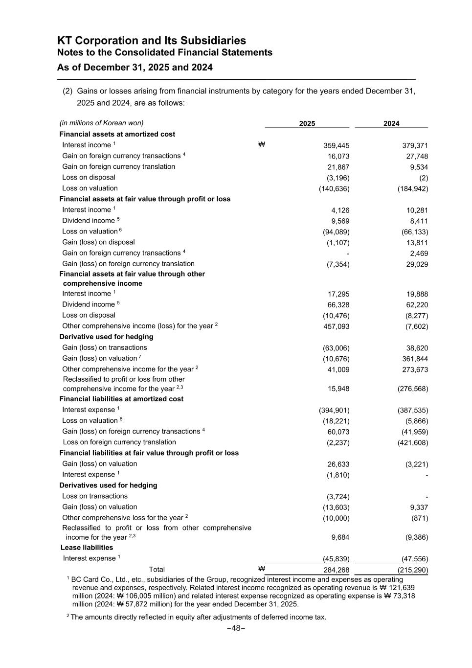 KT Corporation and Its Subsidiaries Notes to the Consolidated Financial Statements As of December 31, 2025 and 2024 (2) Gains or losses arising from financial instruments by category for the years ended December 31, 2025 and 2024, are as follows: (in millions of Korean won) 2025 2024 Financial assets at amortized cost Interest income 1 ₩ 359,445 379,371 Gain on foreign currency transactions 4 16,073 27,748 Gain on foreign currency translation 21,867 9,534 Loss on disposal (3,196) (2) Loss on valuation (140,636) (184,942) Financial assets at fair value through profit or loss Interest income 1 4,126 10,281 Dividend income 5 9,569 8,411 Loss on valuation 6 (94,089) (66,133) Gain (loss) on disposal (1,107) 13,811 Gain on foreign currency transactions 4 - 2,469 Gain (loss) on foreign currency translation (7,354) 29,029 Financial assets at fair value through other comprehensive income Interest income 1 17,295 19,888 Dividend income 5 66,328 62,220 Loss on disposal (10,476) (8,277) Other comprehensive income (loss) for the year 2 457,093 (7,602) Derivative used for hedging Gain (loss) on transactions (63,006) 38,620 Gain (loss) on valuation 7 (10,676) 361,844 Other comprehensive income for the year 2 41,009 273,673 Reclassified to profit or loss from other comprehensive income for the year 2,3 15,948 (276,568) Financial liabilities at amortized cost Interest expense 1 (394,901) (387,535) Loss on valuation 8 (18,221) (5,866) Gain (loss) on foreign currency transactions 4 60,073 (41,959) Loss on foreign currency translation (2,237) (421,608) Financial liabilities at fair value through profit or loss Gain (loss) on valuation 26,633 (3,221) Interest expense 1 (1,810) - Derivatives used for hedging Loss on transactions (3,724) - Gain (loss) on valuation (13,603) 9,337 Other comprehensive loss for the year 2 (10,000) (871) Reclassified to profit or loss from other comprehensive income for the year 2,3 9,684 (9,386) Lease liabilities Interest expense 1 (45,839) (47,556) Total ₩ 284,268 (215,290) 1 BC Card Co., Ltd., etc., subsidiaries of the Group, recognized interest income and expenses as operating revenue and expenses, respectively. Related interest income recognized as operating revenue is ₩ 121,639 million (2024: ₩ 106,005 million) and related interest expense recognized as operating expense is ₩ 73,318 million (2024: ₩ 57,872 million) for the year ended December 31, 2025. 2 The amounts directly reflected in equity after adjustments of deferred income tax. -48-