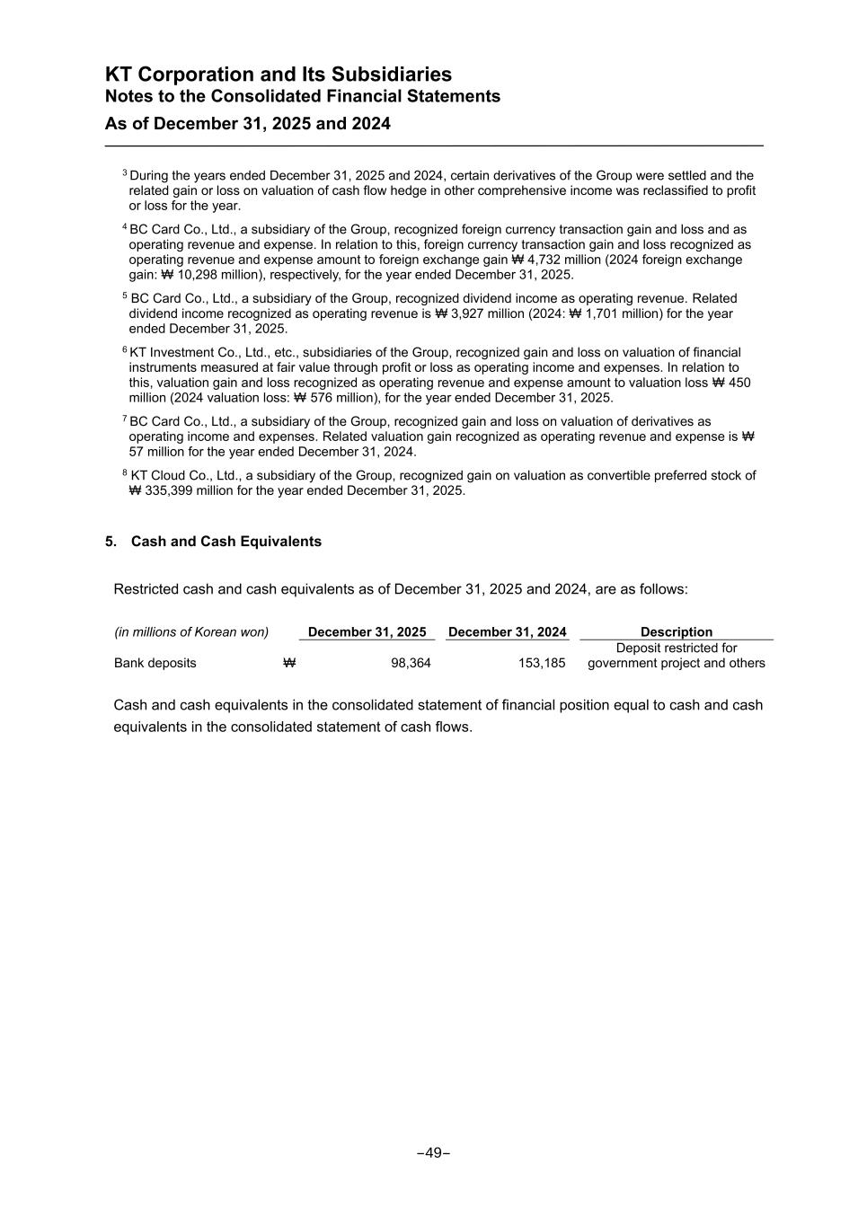 KT Corporation and Its Subsidiaries Notes to the Consolidated Financial Statements As of December 31, 2025 and 2024 3 During the years ended December 31, 2025 and 2024, certain derivatives of the Group were settled and the related gain or loss on valuation of cash flow hedge in other comprehensive income was reclassified to profit or loss for the year. 4 BC Card Co., Ltd., a subsidiary of the Group, recognized foreign currency transaction gain and loss and as operating revenue and expense. In relation to this, foreign currency transaction gain and loss recognized as operating revenue and expense amount to foreign exchange gain ₩ 4,732 million (2024 foreign exchange gain: ₩ 10,298 million), respectively, for the year ended December 31, 2025. 5 BC Card Co., Ltd., a subsidiary of the Group, recognized dividend income as operating revenue. Related dividend income recognized as operating revenue is ₩ 3,927 million (2024: ₩ 1,701 million) for the year ended December 31, 2025. 6 KT Investment Co., Ltd., etc., subsidiaries of the Group, recognized gain and loss on valuation of financial instruments measured at fair value through profit or loss as operating income and expenses. In relation to this, valuation gain and loss recognized as operating revenue and expense amount to valuation loss ₩ 450 million (2024 valuation loss: ₩ 576 million), for the year ended December 31, 2025. 7 BC Card Co., Ltd., a subsidiary of the Group, recognized gain and loss on valuation of derivatives as operating income and expenses. Related valuation gain recognized as operating revenue and expense is ₩ 57 million for the year ended December 31, 2024. 8 KT Cloud Co., Ltd., a subsidiary of the Group, recognized gain on valuation as convertible preferred stock of ₩ 335,399 million for the year ended December 31, 2025. 5. Cash and Cash Equivalents Restricted cash and cash equivalents as of December 31, 2025 and 2024, are as follows: (in millions of Korean won) December 31, 2025 December 31, 2024 Description Bank deposits ₩ 98,364 153,185 Deposit restricted for government project and others Cash and cash equivalents in the consolidated statement of financial position equal to cash and cash equivalents in the consolidated statement of cash flows. -49-