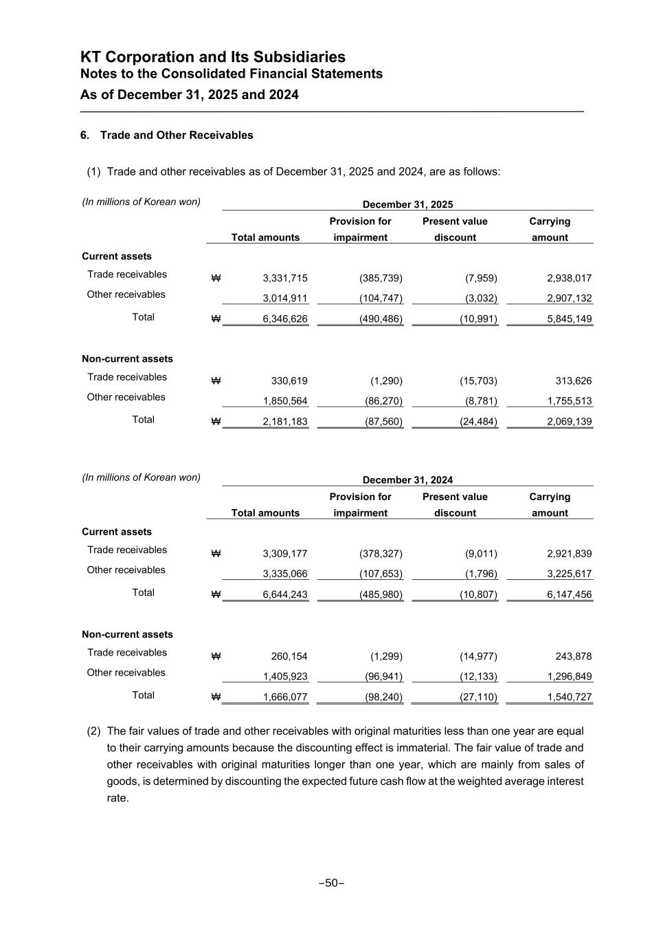KT Corporation and Its Subsidiaries Notes to the Consolidated Financial Statements As of December 31, 2025 and 2024 6. Trade and Other Receivables (1) Trade and other receivables as of December 31, 2025 and 2024, are as follows: (In millions of Korean won) December 31, 2025 Total amounts Provision for impairment Present value discount Carrying amount Current assets Trade receivables ₩ 3,331,715 (385,739) (7,959) 2,938,017 Other receivables 3,014,911 (104,747) (3,032) 2,907,132 Total ₩ 6,346,626 (490,486) (10,991) 5,845,149 Non-current assets Trade receivables ₩ 330,619 (1,290) (15,703) 313,626 Other receivables 1,850,564 (86,270) (8,781) 1,755,513 Total ₩ 2,181,183 (87,560) (24,484) 2,069,139 (In millions of Korean won) December 31, 2024 Total amounts Provision for impairment Present value discount Carrying amount Current assets Trade receivables ₩ 3,309,177 (378,327) (9,011) 2,921,839 Other receivables 3,335,066 (107,653) (1,796) 3,225,617 Total ₩ 6,644,243 (485,980) (10,807) 6,147,456 Non-current assets Trade receivables ₩ 260,154 (1,299) (14,977) 243,878 Other receivables 1,405,923 (96,941) (12,133) 1,296,849 Total ₩ 1,666,077 (98,240) (27,110) 1,540,727 (2) The fair values of trade and other receivables with original maturities less than one year are equal to their carrying amounts because the discounting effect is immaterial. The fair value of trade and other receivables with original maturities longer than one year, which are mainly from sales of goods, is determined by discounting the expected future cash flow at the weighted average interest rate. -50-