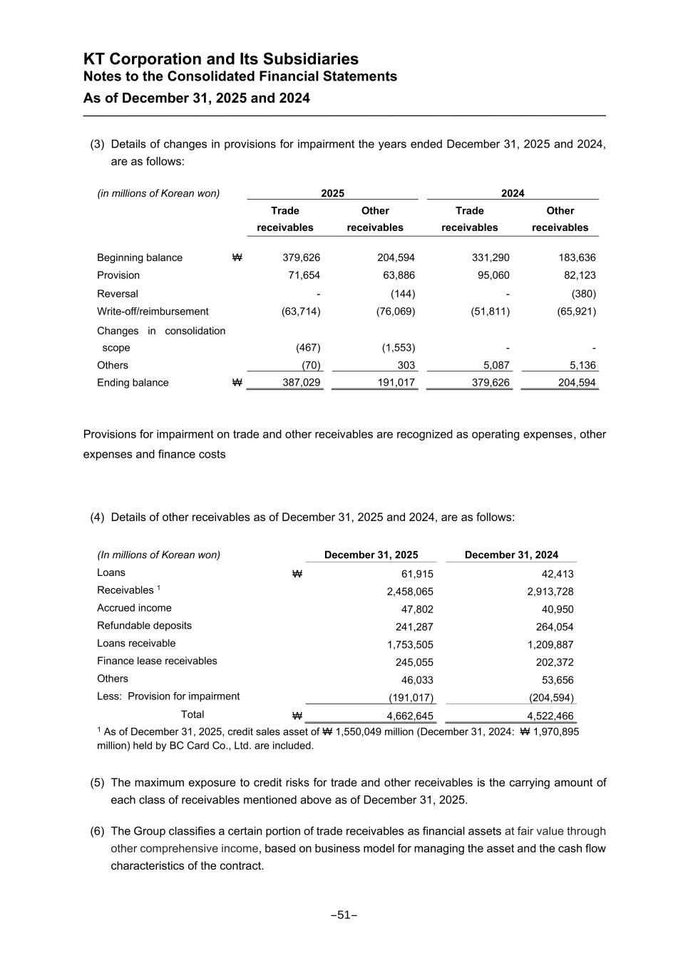 KT Corporation and Its Subsidiaries Notes to the Consolidated Financial Statements As of December 31, 2025 and 2024 (3) Details of changes in provisions for impairment the years ended December 31, 2025 and 2024, are as follows: (in millions of Korean won) 2025 2024 Trade receivables Other receivables Trade receivables Other receivables Beginning balance ₩ 379,626 204,594 331,290 183,636 Provision 71,654 63,886 95,060 82,123 Reversal - (144) - (380) Write-off/reimbursement (63,714) (76,069) (51,811) (65,921) Changes in consolidation scope (467) (1,553) - - Others (70) 303 5,087 5,136 Ending balance ₩ 387,029 191,017 379,626 204,594 Provisions for impairment on trade and other receivables are recognized as operating expenses, other expenses and finance costs (4) Details of other receivables as of December 31, 2025 and 2024, are as follows: 1 As of December 31, 2025, credit sales asset of ₩ 1,550,049 million (December 31, 2024: ₩ 1,970,895 million) held by BC Card Co., Ltd. are included. (5) The maximum exposure to credit risks for trade and other receivables is the carrying amount of each class of receivables mentioned above as of December 31, 2025. (6) The Group classifies a certain portion of trade receivables as financial assets at fair value through other comprehensive income, based on business model for managing the asset and the cash flow characteristics of the contract. (In millions of Korean won) December 31, 2025 December 31, 2024 Loans ₩ 61,915 42,413 Receivables 1 2,458,065 2,913,728 Accrued income 47,802 40,950 Refundable deposits 241,287 264,054 Loans receivable 1,753,505 1,209,887 Finance lease receivables 245,055 202,372 Others 46,033 53,656 Less: Provision for impairment (191,017) (204,594) Total ₩ 4,662,645 4,522,466 -51-