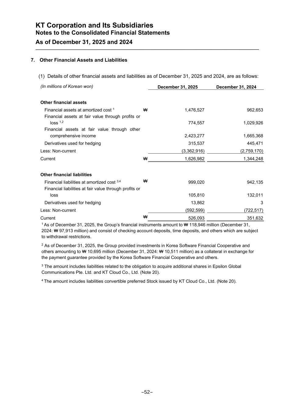 KT Corporation and Its Subsidiaries Notes to the Consolidated Financial Statements As of December 31, 2025 and 2024 7. Other Financial Assets and Liabilities (1) Details of other financial assets and liabilities as of December 31, 2025 and 2024, are as follows: (In millions of Korean won) December 31, 2025 December 31, 2024 Other financial assets Financial assets at amortized cost 1 ₩ 1,476,527 962,653 Financial assets at fair value through profits or loss 1,2 774,557 1,029,926 Financial assets at fair value through other comprehensive income 2,423,277 1,665,368 Derivatives used for hedging 315,537 445,471 Less: Non-current (3,362,916) (2,759,170) Current ₩ 1,626,982 1,344,248 Other financial liabilities Financial liabilities at amortized cost 3,4 ₩ 999,020 942,135 Financial liabilities at fair value through profits or loss 105,810 132,011 Derivatives used for hedging 13,862 3 Less: Non-current (592,599) (722,517) Current ₩ 526,093 351,632 1 As of December 31, 2025, the Group’s financial instruments amount to ₩ 118,946 million (December 31, 2024: ₩ 97,913 million) and consist of checking account deposits, time deposits, and others which are subject to withdrawal restrictions. 2 As of December 31, 2025, the Group provided investments in Korea Software Financial Cooperative and others amounting to ₩ 10,695 million (December 31, 2024: ₩ 10,511 million) as a collateral in exchange for the payment guarantee provided by the Korea Software Financial Cooperative and others. 3 The amount includes liabilities related to the obligation to acquire additional shares in Epsilon Global Communications Pte. Ltd. and KT Cloud Co., Ltd. (Note 20). 4 The amount includes liabilities convertible preferred Stock issued by KT Cloud Co., Ltd. (Note 20). -52-