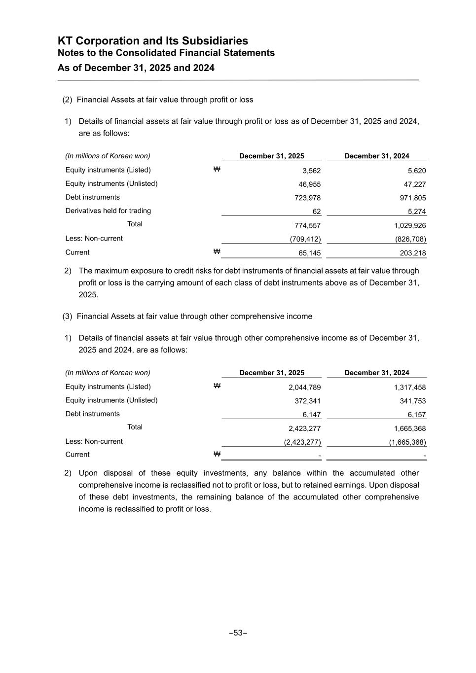 KT Corporation and Its Subsidiaries Notes to the Consolidated Financial Statements As of December 31, 2025 and 2024 (2) Financial Assets at fair value through profit or loss 1) Details of financial assets at fair value through profit or loss as of December 31, 2025 and 2024, are as follows: (In millions of Korean won) December 31, 2025 December 31, 2024 Equity instruments (Listed) ₩ 3,562 5,620 Equity instruments (Unlisted) 46,955 47,227 Debt instruments 723,978 971,805 Derivatives held for trading 62 5,274 Total 774,557 1,029,926 Less: Non-current (709,412) (826,708) Current ₩ 65,145 203,218 2) The maximum exposure to credit risks for debt instruments of financial assets at fair value through profit or loss is the carrying amount of each class of debt instruments above as of December 31, 2025. (3) Financial Assets at fair value through other comprehensive income 1) Details of financial assets at fair value through other comprehensive income as of December 31, 2025 and 2024, are as follows: (In millions of Korean won) December 31, 2025 December 31, 2024 Equity instruments (Listed) ₩ 2,044,789 1,317,458 Equity instruments (Unlisted) 372,341 341,753 Debt instruments 6,147 6,157 Total 2,423,277 1,665,368 Less: Non-current (2,423,277) (1,665,368) Current ₩ - - 2) Upon disposal of these equity investments, any balance within the accumulated other comprehensive income is reclassified not to profit or loss, but to retained earnings. Upon disposal of these debt investments, the remaining balance of the accumulated other comprehensive income is reclassified to profit or loss. -53-
