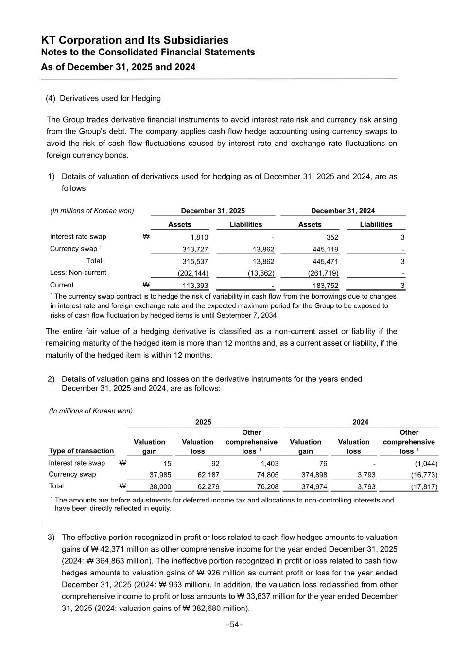 KT Corporation and Its Subsidiaries Notes to the Consolidated Financial Statements As of December 31, 2025 and 2024 (4) Derivatives used for Hedging The Group trades derivative financial instruments to avoid interest rate risk and currency risk arising from the Group's debt. The company applies cash flow hedge accounting using currency swaps to avoid the risk of cash flow fluctuations caused by interest rate and exchange rate fluctuations on foreign currency bonds. 1) Details of valuation of derivatives used for hedging as of December 31, 2025 and 2024, are as follows: (In millions of Korean won) December 31, 2025 December 31, 2024 Assets Liabilities Assets Liabilities Interest rate swap ₩ 1,810 - 352 3 Currency swap 1 313,727 13,862 445,119 - Total 315,537 13,862 445,471 3 Less: Non-current (202,144) (13,862) (261,719) - Current ₩ 113,393 - 183,752 3 1 The currency swap contract is to hedge the risk of variability in cash flow from the borrowings due to changes in interest rate and foreign exchange rate and the expected maximum period for the Group to be exposed to risks of cash flow fluctuation by hedged items is until September 7, 2034. The entire fair value of a hedging derivative is classified as a non-current asset or liability if the remaining maturity of the hedged item is more than 12 months and, as a current asset or liability, if the maturity of the hedged item is within 12 months. 2) Details of valuation gains and losses on the derivative instruments for the years ended December 31, 2025 and 2024, are as follows: (In millions of Korean won) 2025 2024 Type of transaction Valuation gain Valuation loss Other comprehensive loss 1 Valuation gain Valuation loss Other comprehensive loss 1 Interest rate swap ₩ 15 92 1,403 76 - (1,044) Currency swap 37,985 62,187 74,805 374,898 3,793 (16,773) Total ₩ 38,000 62,279 76,208 374,974 3,793 (17,817) 1 The amounts are before adjustments for deferred income tax and allocations to non-controlling interests and have been directly reflected in equity. . 3) The effective portion recognized in profit or loss related to cash flow hedges amounts to valuation gains of ₩ 42,371 million as other comprehensive income for the year ended December 31, 2025 (2024: ₩ 364,863 million). The ineffective portion recognized in profit or loss related to cash flow hedges amounts to valuation gains of ₩ 926 million as current profit or loss for the year ended December 31, 2025 (2024: ₩ 963 million). In addition, the valuation loss reclassified from other comprehensive income to profit or loss amounts to ₩ 33,837 million for the year ended December 31, 2025 (2024: valuation gains of ₩ 382,680 million). -54-