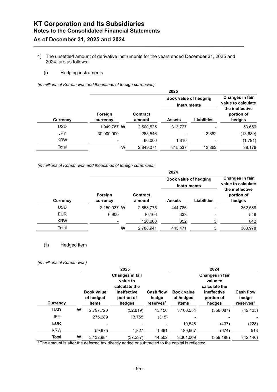 KT Corporation and Its Subsidiaries Notes to the Consolidated Financial Statements As of December 31, 2025 and 2024 4) The unsettled amount of derivative instruments for the years ended December 31, 2025 and 2024, are as follows: (i) Hedging instruments (in millions of Korean won and thousands of foreign currencies) 2025 Book value of hedging instruments Changes in fair value to calculate the ineffective portion of hedges Currency Foreign currency Contract amount Assets Liabilities USD 1,949,767 ₩ 2,500,525 313,727 - 53,656 JPY 30,000,000 288,546 - 13,862 (13,689) KRW - 60,000 1,810 - (1,791) Total ₩ 2,849,071 315,537 13,862 38,176 (in millions of Korean won and thousands of foreign currencies) 2024 Book value of hedging instruments Changes in fair value to calculate the ineffective portion of hedges Currency Foreign currency Contract amount Assets Liabilities USD 2,150,937 ₩ 2,658,775 444,786 - 362,588 EUR 6,900 10,166 333 - 548 KRW - 120,000 352 3 842 Total ₩ 2,788,941 445,471 3 363,978 (ii) Hedged item (in millions of Korean won) 2025 2024 Currency Book value of hedged items Changes in fair value to calculate the ineffective portion of hedges Cash flow hedge reserves1 Book value of hedged items Changes in fair value to calculate the ineffective portion of hedges Cash flow hedge reserves1 USD ₩ 2,797,720 (52,819) 13,156 3,160,554 (358,087) (42,425) JPY 275,289 13,755 (315) - - - EUR - - - 10,548 (437) (228) KRW 59,975 1,827 1,661 189,967 (674) 513 Total ₩ 3,132,984 (37,237) 14,502 3,361,069 (359,198) (42,140) 1 The amount is after the deferred tax directly added or subtracted to the capital is reflected. -55-