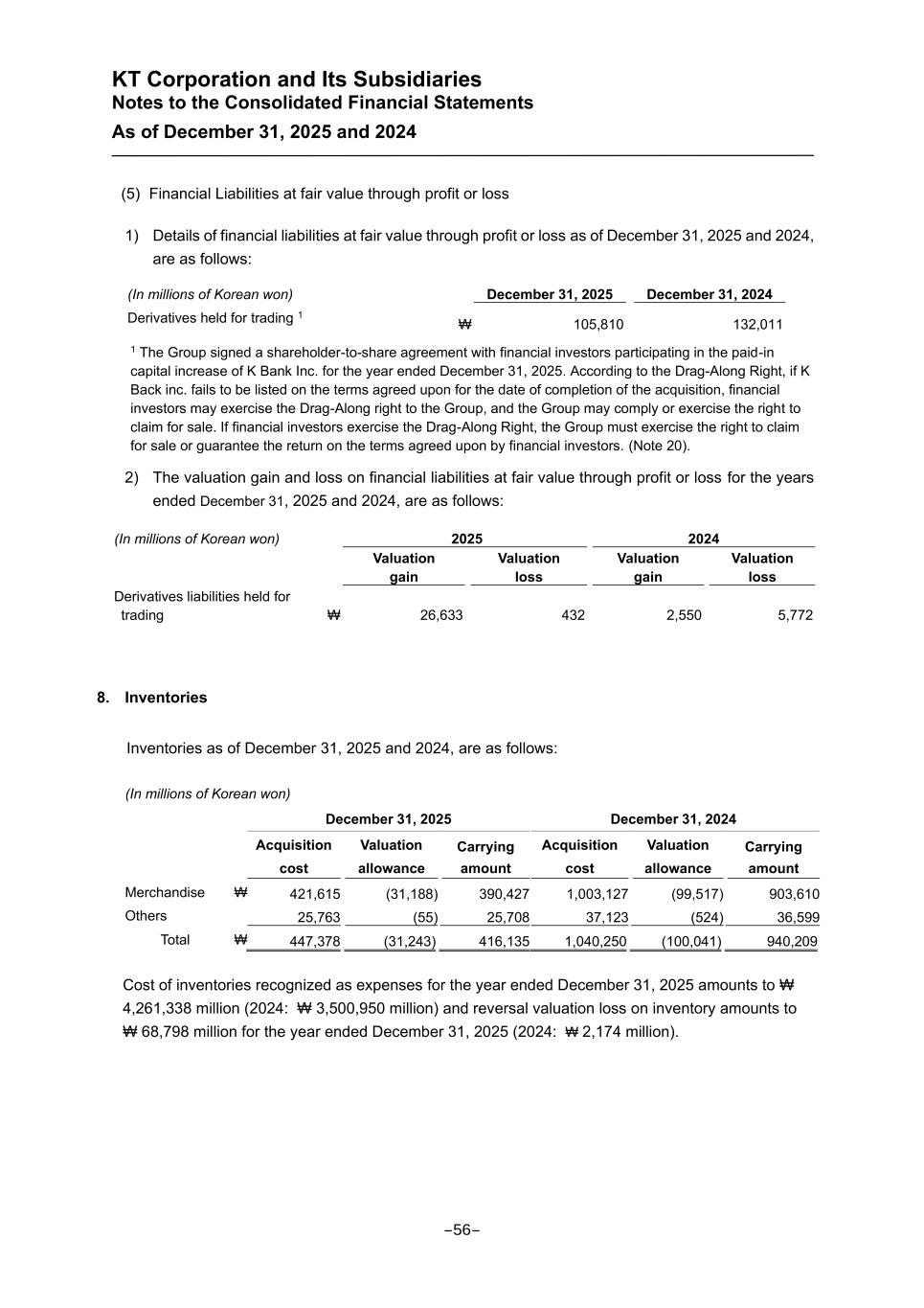KT Corporation and Its Subsidiaries Notes to the Consolidated Financial Statements As of December 31, 2025 and 2024 (5) Financial Liabilities at fair value through profit or loss 1) Details of financial liabilities at fair value through profit or loss as of December 31, 2025 and 2024, are as follows: (In millions of Korean won) December 31, 2025 December 31, 2024 Derivatives held for trading 1 ₩ 105,810 132,011 1 The Group signed a shareholder-to-share agreement with financial investors participating in the paid-in capital increase of K Bank Inc. for the year ended December 31, 2025. According to the Drag-Along Right, if K Back inc. fails to be listed on the terms agreed upon for the date of completion of the acquisition, financial investors may exercise the Drag-Along right to the Group, and the Group may comply or exercise the right to claim for sale. If financial investors exercise the Drag-Along Right, the Group must exercise the right to claim for sale or guarantee the return on the terms agreed upon by financial investors. (Note 20). 2) The valuation gain and loss on financial liabilities at fair value through profit or loss for the years ended December 31, 2025 and 2024, are as follows: (In millions of Korean won) 2025 2024 Valuation gain Valuation loss Valuation gain Valuation loss Derivatives liabilities held for trading ₩ 26,633 432 2,550 5,772 8. Inventories Inventories as of December 31, 2025 and 2024, are as follows: (In millions of Korean won) December 31, 2025 December 31, 2024 Acquisition cost Valuation allowance Carrying amount Acquisition cost Valuation allowance Carrying amount Merchandise ₩ 421,615 (31,188) 390,427 1,003,127 (99,517) 903,610 Others 25,763 (55) 25,708 37,123 (524) 36,599 Total ₩ 447,378 (31,243) 416,135 1,040,250 (100,041) 940,209 Cost of inventories recognized as expenses for the year ended December 31, 2025 amounts to ₩ 4,261,338 million (2024: ₩ 3,500,950 million) and reversal valuation loss on inventory amounts to ₩ 68,798 million for the year ended December 31, 2025 (2024: ₩ 2,174 million). -56-