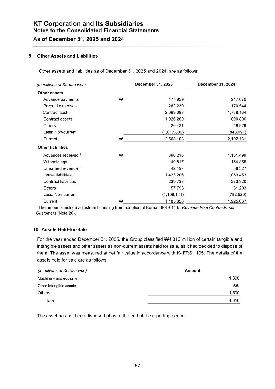 KT Corporation and Its Subsidiaries Notes to the Consolidated Financial Statements As of December 31, 2025 and 2024 9. Other Assets and Liabilities Other assets and liabilities as of December 31, 2025 and 2024, are as follows: (In millions of Korean won) December 31, 2025 December 31, 2024 Other assets Advance payments ₩ 177,929 217,679 Prepaid expenses 262,230 170,544 Contract cost 2,099,088 1,738,164 Contract assets 1,026,260 800,806 Others 20,431 18,929 Less: Non-current (1,017,830) (843,991) Current ₩ 2,568,108 2,102,131 Other liabilities Advances received 1 ₩ 390,216 1,151,499 Withholdings 140,817 154,355 Unearned revenue 1 42,197 38,327 Lease liabilities 1,423,206 1,059,453 Contract liabilities 239,738 273,320 Others 57,793 31,203 Less: Non-current (1,108,141) (782,520) Current ₩ 1,185,826 1,925,637 1 The amounts include adjustments arising from adoption of Korean IFRS 1115 Revenue from Contracts with Customers (Note 26). 10. Assets Held-for-Sale For the year ended December 31, 2025, the Group classified ₩4,316 million of certain tangible and intangible assets and other assets as non-current assets held for sale, as it had decided to dispose of them. The asset was measured at net fair value in accordance with K-IFRS 1105. The details of the assets held for sale are as follows. (in millions of Korean won) Amount Machinery and equipment 1,890 Other Intangible assets 926 Others 1,500 Total 4,316 The asset has not been disposed of as of the end of the reporting period. -57-