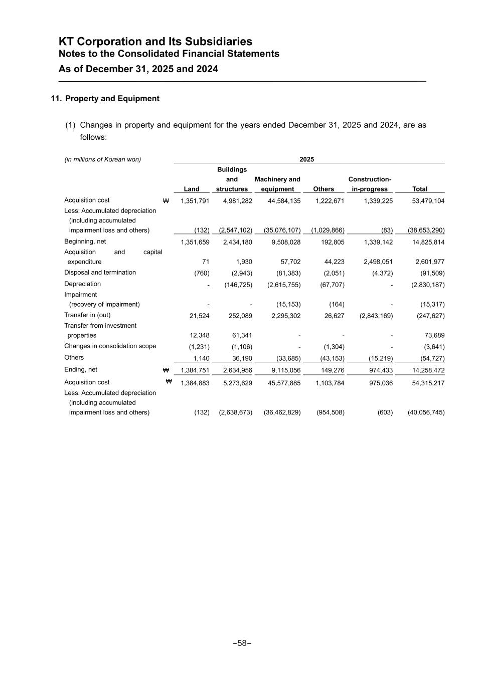 KT Corporation and Its Subsidiaries Notes to the Consolidated Financial Statements As of December 31, 2025 and 2024 11. Property and Equipment (1) Changes in property and equipment for the years ended December 31, 2025 and 2024, are as follows: (in millions of Korean won) 2025 Land Buildings and structures Machinery and equipment Others Construction- in-progress Total Acquisition cost ₩ 1,351,791 4,981,282 44,584,135 1,222,671 1,339,225 53,479,104 Less: Accumulated depreciation (including accumulated impairment loss and others) (132) (2,547,102) (35,076,107) (1,029,866) (83) (38,653,290) Beginning, net 1,351,659 2,434,180 9,508,028 192,805 1,339,142 14,825,814 Acquisition and capital expenditure 71 1,930 57,702 44,223 2,498,051 2,601,977 Disposal and termination (760) (2,943) (81,383) (2,051) (4,372) (91,509) Depreciation - (146,725) (2,615,755) (67,707) - (2,830,187) Impairment (recovery of impairment) - - (15,153) (164) - (15,317) Transfer in (out) 21,524 252,089 2,295,302 26,627 (2,843,169) (247,627) Transfer from investment properties 12,348 61,341 - - - 73,689 Changes in consolidation scope (1,231) (1,106) - (1,304) - (3,641) Others 1,140 36,190 (33,685) (43,153) (15,219) (54,727) Ending, net ₩ 1,384,751 2,634,956 9,115,056 149,276 974,433 14,258,472 Acquisition cost ₩ 1,384,883 5,273,629 45,577,885 1,103,784 975,036 54,315,217 Less: Accumulated depreciation (including accumulated impairment loss and others) (132) (2,638,673) (36,462,829) (954,508) (603) (40,056,745) -58-