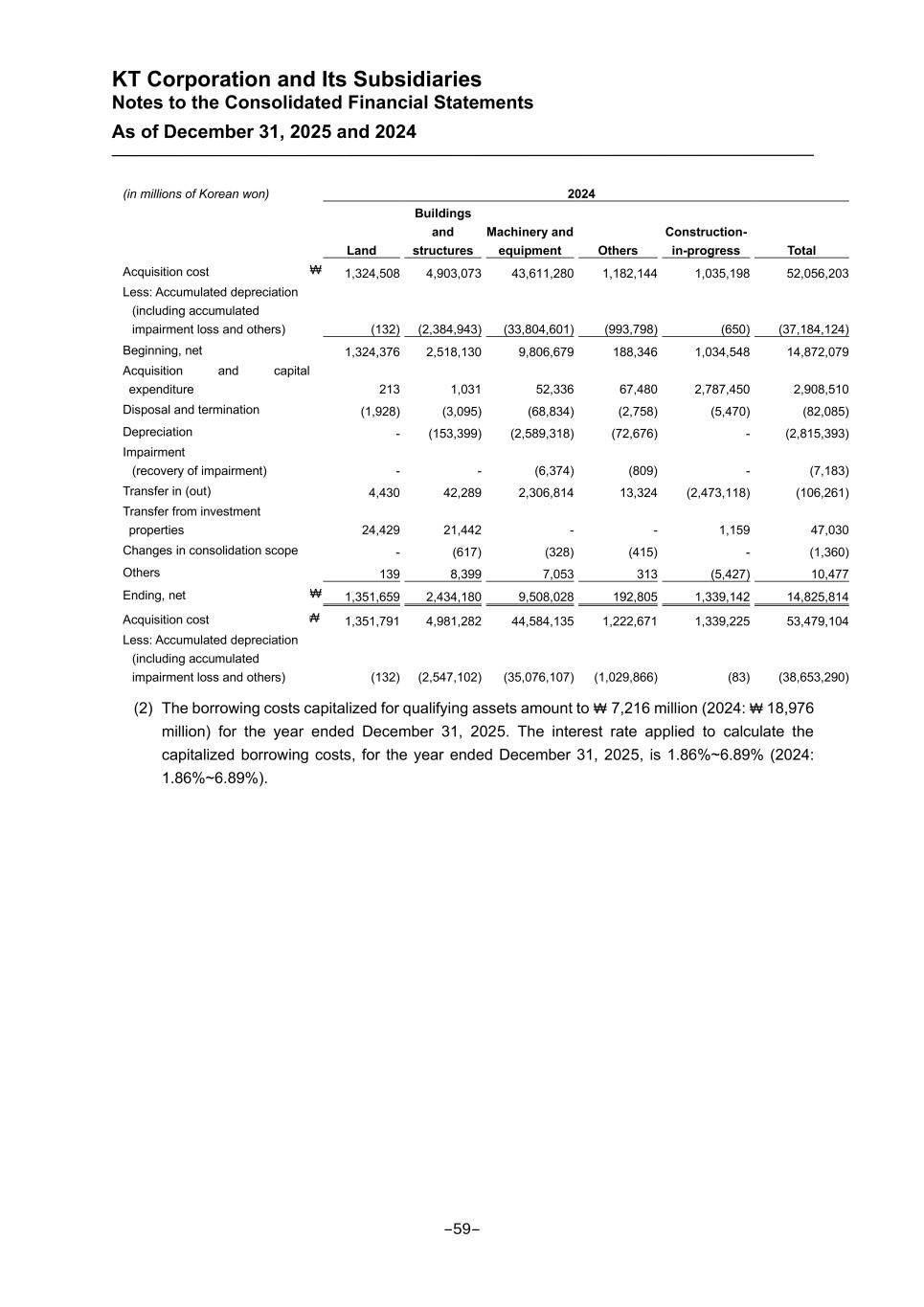 KT Corporation and Its Subsidiaries Notes to the Consolidated Financial Statements As of December 31, 2025 and 2024 (in millions of Korean won) 2024 Land Buildings and structures Machinery and equipment Others Construction- in-progress Total Acquisition cost ₩ 1,324,508 4,903,073 43,611,280 1,182,144 1,035,198 52,056,203 Less: Accumulated depreciation (including accumulated impairment loss and others) (132) (2,384,943) (33,804,601) (993,798) (650) (37,184,124) Beginning, net 1,324,376 2,518,130 9,806,679 188,346 1,034,548 14,872,079 Acquisition and capital expenditure 213 1,031 52,336 67,480 2,787,450 2,908,510 Disposal and termination (1,928) (3,095) (68,834) (2,758) (5,470) (82,085) Depreciation - (153,399) (2,589,318) (72,676) - (2,815,393) Impairment (recovery of impairment) - - (6,374) (809) - (7,183) Transfer in (out) 4,430 42,289 2,306,814 13,324 (2,473,118) (106,261) Transfer from investment properties 24,429 21,442 - - 1,159 47,030 Changes in consolidation scope - (617) (328) (415) - (1,360) Others 139 8,399 7,053 313 (5,427) 10,477 Ending, net ₩ 1,351,659 2,434,180 9,508,028 192,805 1,339,142 14,825,814 Acquisition cost ₩ 1,351,791 4,981,282 44,584,135 1,222,671 1,339,225 53,479,104 Less: Accumulated depreciation (including accumulated impairment loss and others) (132) (2,547,102) (35,076,107) (1,029,866) (83) (38,653,290) (2) The borrowing costs capitalized for qualifying assets amount to ₩ 7,216 million (2024: ₩ 18,976 million) for the year ended December 31, 2025. The interest rate applied to calculate the capitalized borrowing costs, for the year ended December 31, 2025, is 1.86%~6.89% (2024: 1.86%~6.89%). -59-