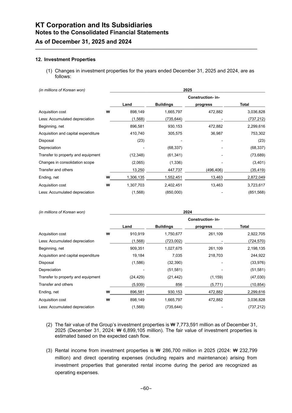 KT Corporation and Its Subsidiaries Notes to the Consolidated Financial Statements As of December 31, 2025 and 2024 12. Investment Properties (1) Changes in investment properties for the years ended December 31, 2025 and 2024, are as follows: (in millions of Korean won) 2025 Land Buildings Construction- in- progress Total Acquisition cost ₩ 898,149 1,665,797 472,882 3,036,828 Less: Accumulated depreciation (1,568) (735,644) - (737,212) Beginning, net 896,581 930,153 472,882 2,299,616 Acquisition and capital expenditure 410,740 305,575 36,987 753,302 Disposal (23) - - (23) Depreciation - (68,337) - (68,337) Transfer to property and equipment (12,348) (61,341) - (73,689) Changes in consolidation scope (2,065) (1,336) - (3,401) Transfer and others 13,250 447,737 (496,406) (35,419) Ending, net ₩ 1,306,135 1,552,451 13,463 2,872,049 Acquisition cost ₩ 1,307,703 2,402,451 13,463 3,723,617 Less: Accumulated depreciation (1,568) (850,000) - (851,568) (in millions of Korean won) 2024 Land Buildings Construction- in- progress Total Acquisition cost ₩ 910,919 1,750,677 261,109 2,922,705 Less: Accumulated depreciation (1,568) (723,002) - (724,570) Beginning, net 909,351 1,027,675 261,109 2,198,135 Acquisition and capital expenditure 19,184 7,035 218,703 244,922 Disposal (1,586) (32,390) - (33,976) Depreciation - (51,581) - (51,581) Transfer to property and equipment (24,429) (21,442) (1,159) (47,030) Transfer and others (5,939) 856 (5,771) (10,854) Ending, net ₩ 896,581 930,153 472,882 2,299,616 Acquisition cost ₩ 898,149 1,665,797 472,882 3,036,828 Less: Accumulated depreciation (1,568) (735,644) - (737,212) (2) The fair value of the Group’s investment properties is ₩ 7,773,591 million as of December 31, 2025 (December 31, 2024: ₩ 6,899,105 million). The fair value of investment properties is estimated based on the expected cash flow. (3) Rental income from investment properties is ₩ 286,700 million in 2025 (2024: ₩ 232,799 million) and direct operating expenses (including repairs and maintenance) arising from investment properties that generated rental income during the period are recognized as operating expenses. -60-