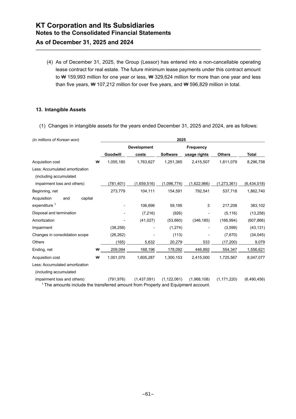 KT Corporation and Its Subsidiaries Notes to the Consolidated Financial Statements As of December 31, 2025 and 2024 (4) As of December 31, 2025, the Group (Lessor) has entered into a non-cancellable operating lease contract for real estate. The future minimum lease payments under this contract amount to ₩ 159,993 million for one year or less, ₩ 329,624 million for more than one year and less than five years, ₩ 107,212 million for over five years, and ₩ 596,829 million in total. 13. Intangible Assets (1) Changes in intangible assets for the years ended December 31, 2025 and 2024, are as follows: (in millions of Korean won) 2025 Goodwill Development costs Software Frequency usage rights Others Total Acquisition cost ₩ 1,055,180 1,763,627 1,251,365 2,415,507 1,811,079 8,296,758 Less: Accumulated amortization (including accumulated impairment loss and others) (781,401) (1,659,516) (1,096,774) (1,622,966) (1,273,361) (6,434,018) Beginning, net 273,779 104,111 154,591 792,541 537,718 1,862,740 Acquisition and capital expenditure 1 - 106,696 59,195 3 217,208 383,102 Disposal and termination - (7,216) (926) - (5,116) (13,258) Amortization - (41,027) (53,660) (346,185) (166,994) (607,866) Impairment (38,258) - (1,274) - (3,599) (43,131) Changes in consolidation scope (26,262) - (113) - (7,670) (34,045) Others (165) 5,632 20,279 533 (17,200) 9,079 Ending, net ₩ 209,094 168,196 178,092 446,892 554,347 1,556,621 Acquisition cost ₩ 1,001,070 1,605,287 1,300,153 2,415,000 1,725,567 8,047,077 Less: Accumulated amortization (including accumulated impairment loss and others) (791,976) (1,437,091) (1,122,061) (1,968,108) (1,171,220) (6,490,456) 1 The amounts include the transferred amount from Property and Equipment account. -61-