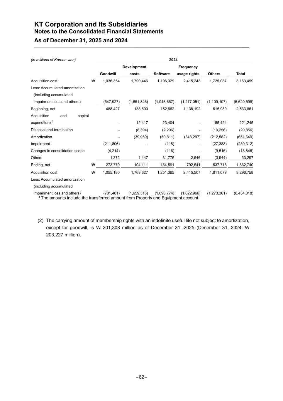 KT Corporation and Its Subsidiaries Notes to the Consolidated Financial Statements As of December 31, 2025 and 2024 (in millions of Korean won) 2024 Goodwill Development costs Software Frequency usage rights Others Total Acquisition cost ₩ 1,036,354 1,790,446 1,196,329 2,415,243 1,725,087 8,163,459 Less: Accumulated amortization (including accumulated impairment loss and others) (547,927) (1,651,846) (1,043,667) (1,277,051) (1,109,107) (5,629,598) Beginning, net 488,427 138,600 152,662 1,138,192 615,980 2,533,861 Acquisition and capital expenditure 1 - 12,417 23,404 - 185,424 221,245 Disposal and termination - (8,394) (2,206) - (10,256) (20,856) Amortization - (39,959) (50,811) (348,297) (212,582) (651,649) Impairment (211,806) - (118) - (27,388) (239,312) Changes in consolidation scope (4,214) - (116) - (9,516) (13,846) Others 1,372 1,447 31,776 2,646 (3,944) 33,297 Ending, net ₩ 273,779 104,111 154,591 792,541 537,718 1,862,740 Acquisition cost ₩ 1,055,180 1,763,627 1,251,365 2,415,507 1,811,079 8,296,758 Less: Accumulated amortization (including accumulated impairment loss and others) (781,401) (1,659,516) (1,096,774) (1,622,966) (1,273,361) (6,434,018) 1 The amounts include the transferred amount from Property and Equipment account. (2) The carrying amount of membership rights with an indefinite useful life not subject to amortization, except for goodwill, is ₩ 201,308 million as of December 31, 2025 (December 31, 2024: ₩ 203,227 million). -62-