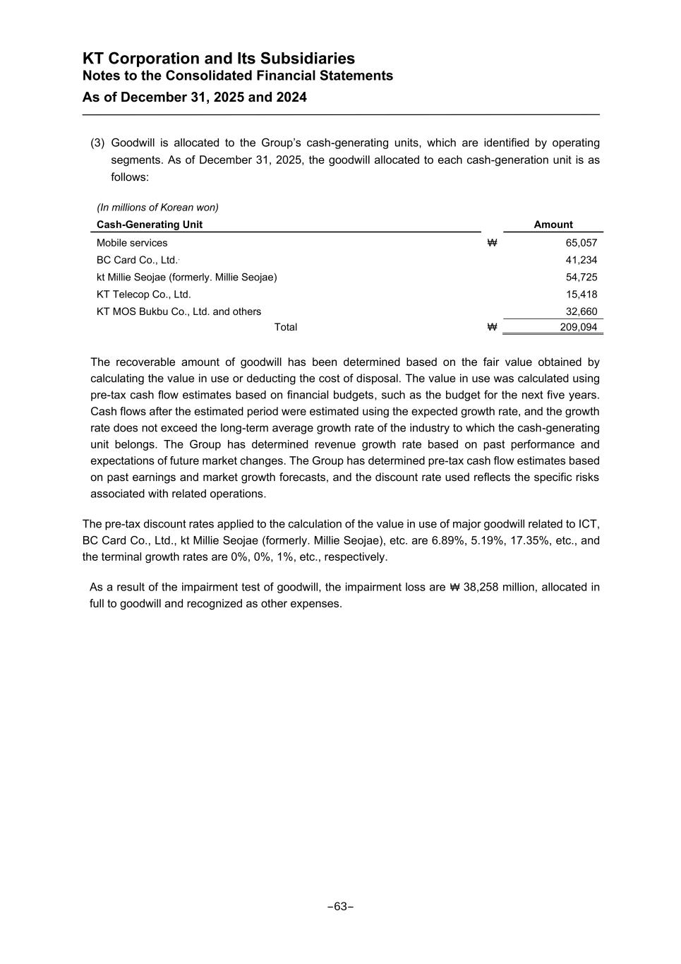 KT Corporation and Its Subsidiaries Notes to the Consolidated Financial Statements As of December 31, 2025 and 2024 (3) Goodwill is allocated to the Group’s cash-generating units, which are identified by operating segments. As of December 31, 2025, the goodwill allocated to each cash-generation unit is as follows: (In millions of Korean won) Cash-Generating Unit Amount Mobile services ₩ 65,057 BC Card Co., Ltd.. 41,234 kt Millie Seojae (formerly. Millie Seojae) 54,725 KT Telecop Co., Ltd. 15,418 KT MOS Bukbu Co., Ltd. and others 32,660 Total ₩ 209,094 The recoverable amount of goodwill has been determined based on the fair value obtained by calculating the value in use or deducting the cost of disposal. The value in use was calculated using pre-tax cash flow estimates based on financial budgets, such as the budget for the next five years. Cash flows after the estimated period were estimated using the expected growth rate, and the growth rate does not exceed the long-term average growth rate of the industry to which the cash-generating unit belongs. The Group has determined revenue growth rate based on past performance and expectations of future market changes. The Group has determined pre-tax cash flow estimates based on past earnings and market growth forecasts, and the discount rate used reflects the specific risks associated with related operations. The pre-tax discount rates applied to the calculation of the value in use of major goodwill related to ICT, BC Card Co., Ltd., kt Millie Seojae (formerly. Millie Seojae), etc. are 6.89%, 5.19%, 17.35%, etc., and the terminal growth rates are 0%, 0%, 1%, etc., respectively. As a result of the impairment test of goodwill, the impairment loss are ₩ 38,258 million, allocated in full to goodwill and recognized as other expenses. -63-