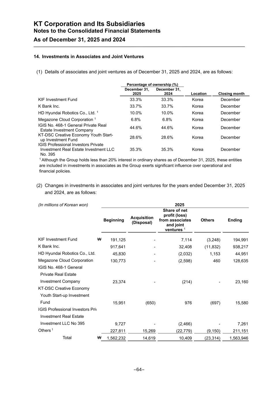 KT Corporation and Its Subsidiaries Notes to the Consolidated Financial Statements As of December 31, 2025 and 2024 14. Investments in Associates and Joint Ventures (1) Details of associates and joint ventures as of December 31, 2025 and 2024, are as follows: Percentage of ownership (%) Location Closing month December 31, 2025 December 31, 2024 KIF Investment Fund 33.3% 33.3% Korea December K Bank Inc. 33.7% 33.7% Korea December HD Hyundai Robotics Co., Ltd. 1 10.0% 10.0% Korea December Megazone Cloud Corporation 1 6.8% 6.8% Korea December IGIS No. 468-1 General Private Real Estate Investment Company 44.6% 44.6% Korea December KT-DSC Creative Economy Youth Start- up Investment Fund 28.6% 28.6% Korea December IGIS Professional Investors Private Investment Real Estate Investment LLC No. 395 35.3% 35.3% Korea December 1 Although the Group holds less than 20% interest in ordinary shares as of December 31, 2025, these entities are included in investments in associates as the Group exerts significant influence over operational and financial policies. (2) Changes in investments in associates and joint ventures for the years ended December 31, 2025 and 2024, are as follows: (In millions of Korean won) 2025 Beginning Acquisition (Disposal) Share of net profit (loss) from associates and joint ventures 1 Others Ending KIF Investment Fund ₩ 191,125 - 7,114 (3,248) 194,991 K Bank Inc. 917,641 - 32,408 (11,832) 938,217 HD Hyundai Robotics Co., Ltd. 45,830 - (2,032) 1,153 44,951 Megazone Cloud Corporation 130,773 - (2,598) 460 128,635 IGIS No. 468-1 General Private Real Estate Investment Company 23,374 - (214) - 23,160 KT-DSC Creative Economy Youth Start-up Investment Fund 15,951 (650) 976 (697) 15,580 IGIS Professional Investors Private Investment Real Estate Investment LLC No 395 9,727 - (2,466) - 7,261 Others 1 227,811 15,269 (22,779) (9,150) 211,151 Total ₩ 1,562,232 14,619 10,409 (23,314) 1,563,946 -64-