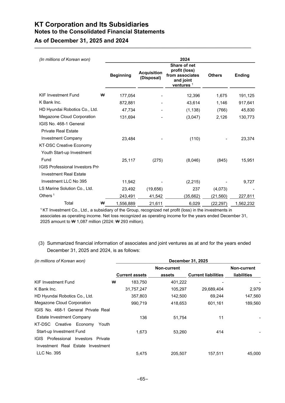 KT Corporation and Its Subsidiaries Notes to the Consolidated Financial Statements As of December 31, 2025 and 2024 (In millions of Korean won) 2024 Beginning Acquisition (Disposal) Share of net profit (loss) from associates and joint ventures 1 Others Ending KIF Investment Fund ₩ 177,054 - 12,396 1,675 191,125 K Bank Inc. 872,881 - 43,614 1,146 917,641 HD Hyundai Robotics Co., Ltd. 47,734 - (1,138) (766) 45,830 Megazone Cloud Corporation 131,694 - (3,047) 2,126 130,773 IGIS No. 468-1 General Private Real Estate Investment Company 23,484 - (110) - 23,374 KT-DSC Creative Economy Youth Start-up Investment Fund 25,117 (275) (8,046) (845) 15,951 IGIS Professional Investors Private Investment Real Estate Investment LLC No 395 11,942 - (2,215) - 9,727 LS Marine Solution Co., Ltd. 23,492 (19,656) 237 (4,073) - Others 1 243,491 41,542 (35,662) (21,560) 227,811 Total ₩ 1,556,889 21,611 6,029 (22,297) 1,562,232 1 KT Investment Co., Ltd., a subsidiary of the Group, recognized net profit (loss) in the investments in associates as operating income. Net loss recognized as operating income for the years ended December 31, 2025 amount to ₩ 1,087 million (2024: ₩ 293 million). (3) Summarized financial information of associates and joint ventures as at and for the years ended December 31, 2025 and 2024, is as follows: (in millions of Korean won) December 31, 2025 Current assets Non-current assets Current liabilities Non-current liabilities KIF Investment Fund ₩ 183,750 401,222 - - K Bank Inc. 31,757,247 105,297 29,689,404 2,979 HD Hyundai Robotics Co., Ltd. 357,803 142,500 69,244 147,560 Megazone Cloud Corporation 990,719 418,653 601,161 189,560 IGIS No. 468-1 General Private Real Estate Investment Company 136 51,754 11 - KT-DSC Creative Economy Youth Start-up Investment Fund 1,673 53,260 414 - IGIS Professional Investors Private Investment Real Estate Investment LLC No. 395 5,475 205,507 157,511 45,000 -65-