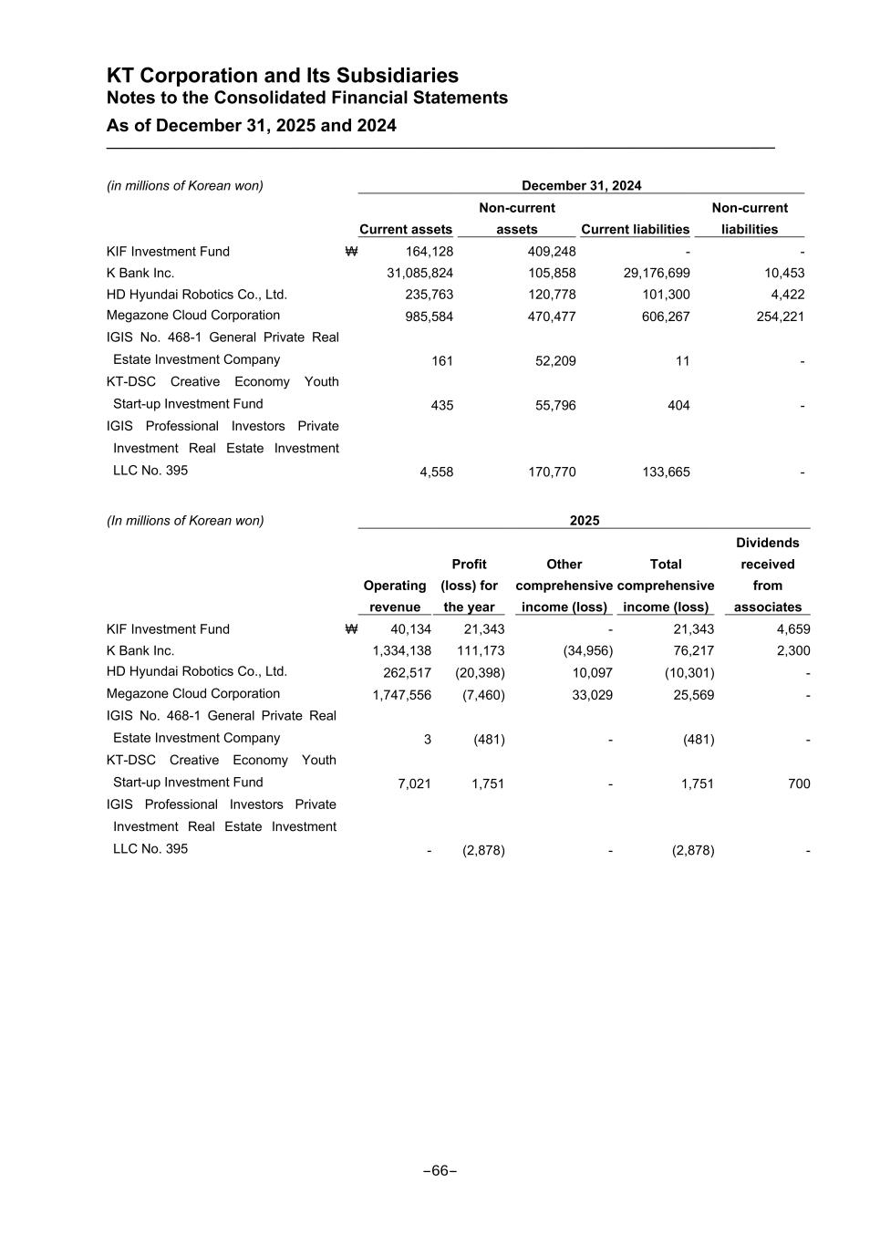 KT Corporation and Its Subsidiaries Notes to the Consolidated Financial Statements As of December 31, 2025 and 2024 (in millions of Korean won) December 31, 2024 Current assets Non-current assets Current liabilities Non-current liabilities KIF Investment Fund ₩ 164,128 409,248 - - K Bank Inc. 31,085,824 105,858 29,176,699 10,453 HD Hyundai Robotics Co., Ltd. 235,763 120,778 101,300 4,422 Megazone Cloud Corporation 985,584 470,477 606,267 254,221 IGIS No. 468-1 General Private Real Estate Investment Company 161 52,209 11 - KT-DSC Creative Economy Youth Start-up Investment Fund 435 55,796 404 - IGIS Professional Investors Private Investment Real Estate Investment LLC No. 395 4,558 170,770 133,665 - (In millions of Korean won) 2025 Operating revenue Profit (loss) for the year Other comprehensive income (loss) Total comprehensive income (loss) Dividends received from associates KIF Investment Fund ₩ 40,134 21,343 - 21,343 4,659 K Bank Inc. 1,334,138 111,173 (34,956) 76,217 2,300 HD Hyundai Robotics Co., Ltd. 262,517 (20,398) 10,097 (10,301) - Megazone Cloud Corporation 1,747,556 (7,460) 33,029 25,569 - IGIS No. 468-1 General Private Real Estate Investment Company 3 (481) - (481) - KT-DSC Creative Economy Youth Start-up Investment Fund 7,021 1,751 - 1,751 700 IGIS Professional Investors Private Investment Real Estate Investment LLC No. 395 - (2,878) - (2,878) - -66-