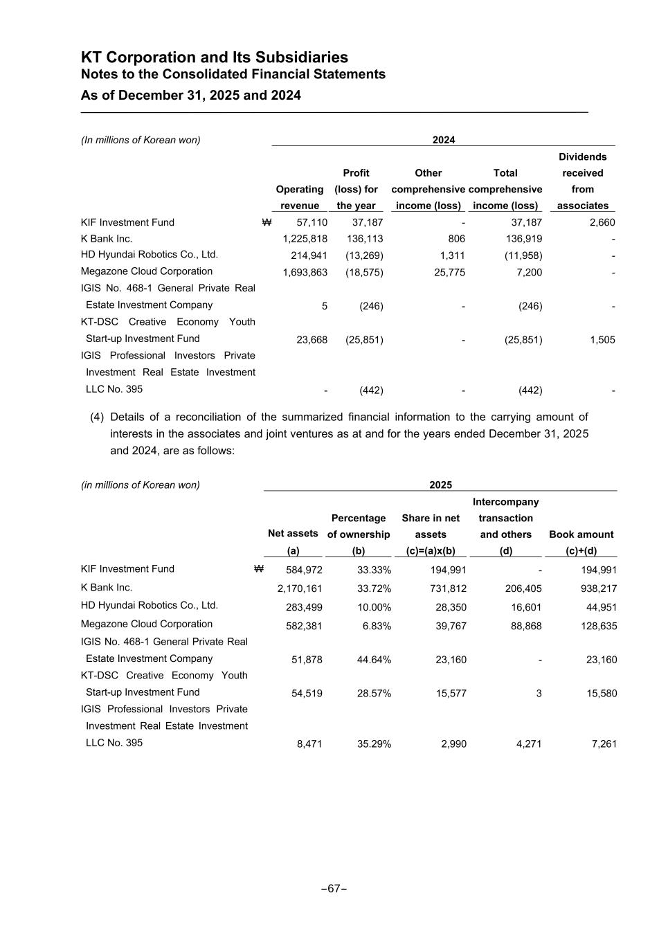 KT Corporation and Its Subsidiaries Notes to the Consolidated Financial Statements As of December 31, 2025 and 2024 (In millions of Korean won) 2024 Operating revenue Profit (loss) for the year Other comprehensive income (loss) Total comprehensive income (loss) Dividends received from associates KIF Investment Fund ₩ 57,110 37,187 - 37,187 2,660 K Bank Inc. 1,225,818 136,113 806 136,919 - HD Hyundai Robotics Co., Ltd. 214,941 (13,269) 1,311 (11,958) - Megazone Cloud Corporation 1,693,863 (18,575) 25,775 7,200 - IGIS No. 468-1 General Private Real Estate Investment Company 5 (246) - (246) - KT-DSC Creative Economy Youth Start-up Investment Fund 23,668 (25,851) - (25,851) 1,505 IGIS Professional Investors Private Investment Real Estate Investment LLC No. 395 - (442) - (442) - (4) Details of a reconciliation of the summarized financial information to the carrying amount of interests in the associates and joint ventures as at and for the years ended December 31, 2025 and 2024, are as follows: (in millions of Korean won) 2025 Net assets (a) Percentage of ownership (b) Share in net assets (c)=(a)x(b) Intercompany transaction and others (d) Book amount (c)+(d) KIF Investment Fund ₩ 584,972 33.33% 194,991 - 194,991 K Bank Inc. 2,170,161 33.72% 731,812 206,405 938,217 HD Hyundai Robotics Co., Ltd. 283,499 10.00% 28,350 16,601 44,951 Megazone Cloud Corporation 582,381 6.83% 39,767 88,868 128,635 IGIS No. 468-1 General Private Real Estate Investment Company 51,878 44.64% 23,160 - 23,160 KT-DSC Creative Economy Youth Start-up Investment Fund 54,519 28.57% 15,577 3 15,580 IGIS Professional Investors Private Investment Real Estate Investment LLC No. 395 8,471 35.29% 2,990 4,271 7,261 -67-