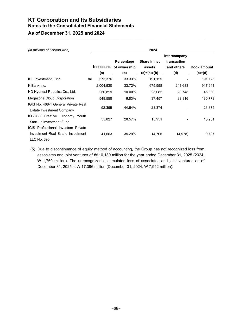 KT Corporation and Its Subsidiaries Notes to the Consolidated Financial Statements As of December 31, 2025 and 2024 (in millions of Korean won) 2024 Net assets (a) Percentage of ownership (b) Share in net assets (c)=(a)x(b) Intercompany transaction and others (d) Book amount (c)+(d) KIF Investment Fund ₩ 573,376 33.33% 191,125 - 191,125 K Bank Inc. 2,004,530 33.72% 675,958 241,683 917,641 HD Hyundai Robotics Co., Ltd. 250,819 10.00% 25,082 20,748 45,830 Megazone Cloud Corporation 548,558 6.83% 37,457 93,316 130,773 IGIS No. 468-1 General Private Real Estate Investment Company 52,359 44.64% 23,374 - 23,374 KT-DSC Creative Economy Youth Start-up Investment Fund 55,827 28.57% 15,951 - 15,951 IGIS Professional Investors Private Investment Real Estate Investment LLC No. 395 41,663 35.29% 14,705 (4,978) 9,727 (5) Due to discontinuance of equity method of accounting, the Group has not recognized loss from associates and joint ventures of ₩ 10,130 million for the year ended December 31, 2025 (2024: ₩ 1,760 million). The unrecognized accumulated loss of associates and joint ventures as of December 31, 2025 is ₩ 17,396 million (December 31, 2024: ₩ 7,942 million). -68-