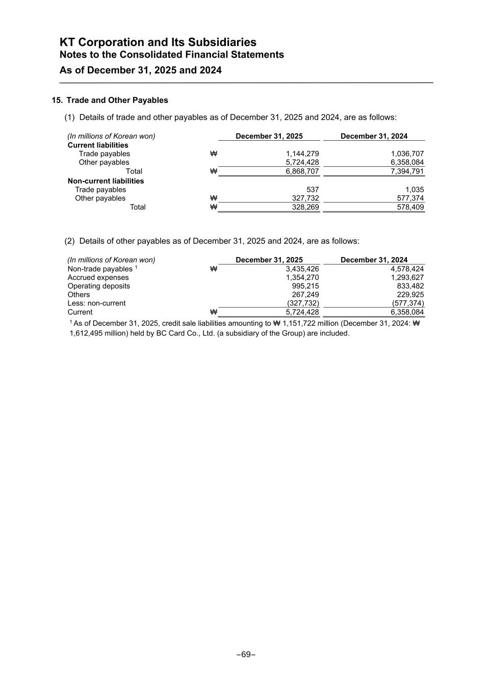 KT Corporation and Its Subsidiaries Notes to the Consolidated Financial Statements As of December 31, 2025 and 2024 15. Trade and Other Payables (1) Details of trade and other payables as of December 31, 2025 and 2024, are as follows: (In millions of Korean won) December 31, 2025 December 31, 2024 Current liabilities Trade payables ₩ 1,144,279 1,036,707 Other payables 5,724,428 6,358,084 Total ₩ 6,868,707 7,394,791 Non-current liabilities Trade payables 537 1,035 Other payables ₩ 327,732 577,374 Total ₩ 328,269 578,409 (2) Details of other payables as of December 31, 2025 and 2024, are as follows: (In millions of Korean won) December 31, 2025 December 31, 2024 Non-trade payables 1 ₩ 3,435,426 4,578,424 Accrued expenses 1,354,270 1,293,627 Operating deposits 995,215 833,482 Others 267,249 229,925 Less: non-current (327,732) (577,374) Current ₩ 5,724,428 6,358,084 1 As of December 31, 2025, credit sale liabilities amounting to ₩ 1,151,722 million (December 31, 2024: ₩ 1,612,495 million) held by BC Card Co., Ltd. (a subsidiary of the Group) are included. -69-