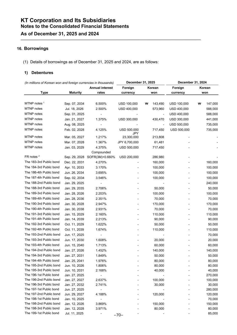 KT Corporation and Its Subsidiaries Notes to the Consolidated Financial Statements As of December 31, 2025 and 2024 16. Borrowings (1) Details of borrowings as of December 31, 2025 and 2024, are as follows: 1) Debentures (In millions of Korean won and foreign currencies in thousands) December 31, 2025 December 31, 2024 Type Maturity Annual interest rates Foreign currency Korean won Foreign currency Korean won MTNP notes 1 Sep. 07, 2034 6.500% USD 100,000 ₩ 143,490 USD 100,000 ₩ 147,000 MTNP notes Jul. 18, 2026 2.500% USD 400,000 573,960 USD 400,000 588,000 MTNP notes Sep. 01, 2025 - - - USD 400,000 588,000 MTNP notes Jan. 21, 2027 1.375% USD 300,000 430,470 USD 300,000 441,000 MTNP notes Aug. 08, 2025 - - - USD 500,000 735,000 MTNP notes Feb. 02, 2028 4.125% USD 500,000 717,450 USD 500,000 735,000 MTNP notes Mar. 05, 2027 1.217% JPY 23,300,000 213,808 - - MTNP notes Mar. 07, 2028 1.367% JPY 6,700,000 61,481 - - MTNP notes Jan. 03, 2029 4.375% USD 500,000 717,450 - - FR notes 2 Sep. 29, 2028 Compounded SOFR(3M)+0.660% USD 200,000 286,980 - - The 183-3rd Public bond Dec. 22, 2031 4.270% - 160,000 - 160,000 The 184-3rd Public bond Apr. 10, 2033 3.170% - 100,000 - 100,000 The 186-4th Public bond Jun. 26, 2034 3.695% - 100,000 - 100,000 The 187-4th Public bond Sep. 02, 2034 3.546% - 100,000 - 100,000 The 188-2nd Public bond Jan. 29, 2025 - - - - 240,000 The 188-3rd Public bond Jan. 29, 2035 2.706% - 50,000 - 50,000 The 189-3rd Public bond Jan. 28, 2026 2.203% - 100,000 - 100,000 The 189-4th Public bond Jan. 28, 2036 2.351% - 70,000 - 70,000 The 190-3rd Public bond Jan. 30, 2028 2.947% - 170,000 - 170,000 The 190-4th Public bond Jan. 30, 2038 2.931% - 70,000 - 70,000 The 191-3rd Public bond Jan. 15, 2029 2.160% - 110,000 - 110,000 The 191-4th Public bond Jan. 14, 2039 2.213% - 90,000 - 90,000 The 192-3rd Public bond Oct. 11, 2029 1.622% - 50,000 - 50,000 The 192-4th Public bond Oct. 11, 2039 1.674% - 110,000 - 110,000 The 193-2nd Public bond Jun. 17, 2025 - - - - 70,000 The 193-3rd Public bond Jun. 17, 2030 1.608% - 20,000 - 20,000 The 193-4th Public bond Jun. 15, 2040 1.713% - 60,000 - 60,000 The 194-2nd Public bond Jan. 27, 2026 1.452% - 140,000 - 140,000 The 194-3rd Public bond Jan. 27, 2031 1.849% - 50,000 - 50,000 The 194-4th Public bond Jan. 25, 2041 1.976% - 80,000 - 80,000 The 195-2nd Public bond Jun. 10, 2026 1.806% - 80,000 - 80,000 The 195-3rd Public bond Jun. 10, 2031 2.168% - 40,000 - 40,000 The 196-1st Public bond Jan. 27, 2025 - - - - 270,000 The 196-2nd Public bond Jan. 27, 2027 2.637% - 100,000 - 100,000 The 196-3rd Public bond Jan. 27, 2032 2.741% - 30,000 - 30,000 The 197-1st Public bond Jun. 27, 2025 - - - - 280,000 The 197-2nd Public bond Jun. 29, 2027 4.188% - 120,000 - 120,000 The 198-1st Public bond Jan. 10, 2025 - - - - 70,000 The 198-2nd Public bond Jan. 12, 2026 3.869% - 150,000 - 150,000 The 198-3rd Public bond Jan. 12, 2028 3.971% - 80,000 - 80,000 The 199-1st Public bond Jul. 11, 2025 - - - - 85,000 -70-