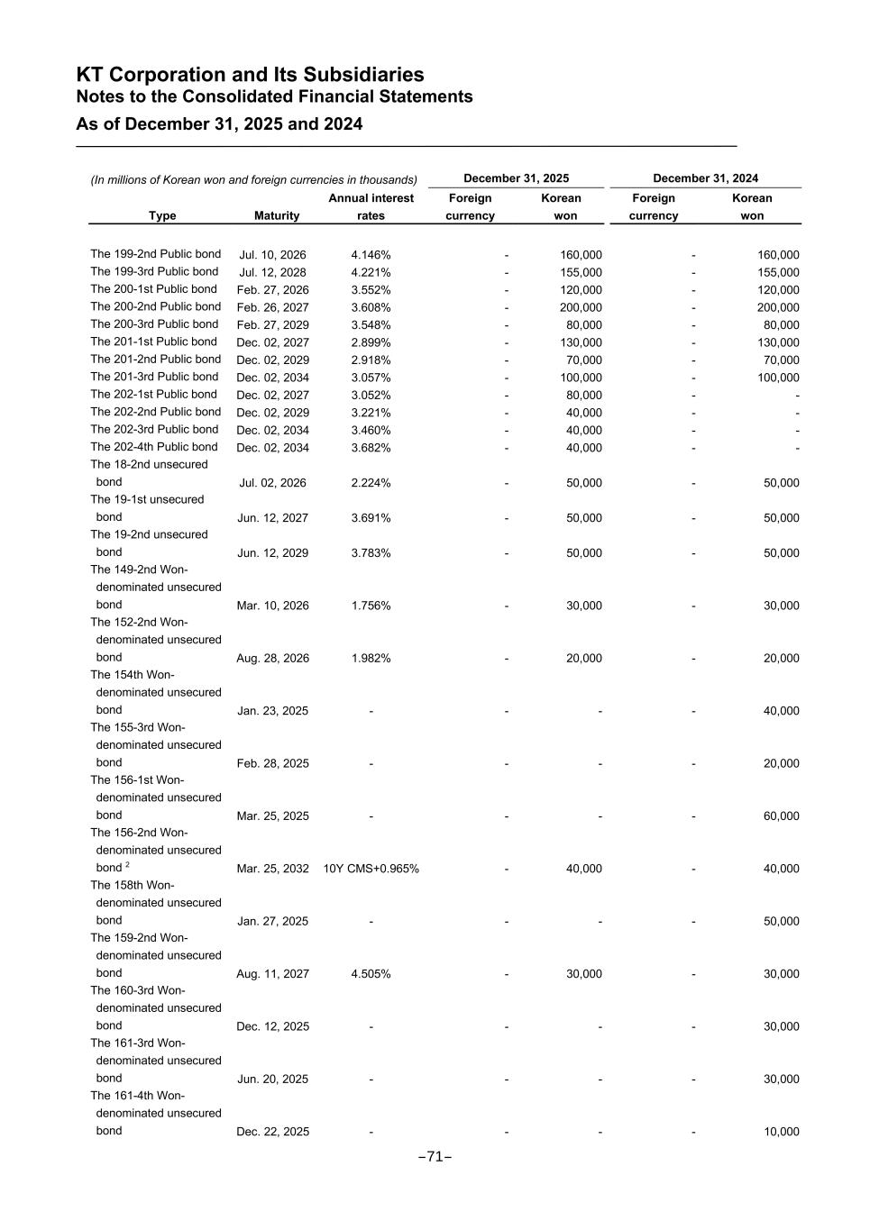 KT Corporation and Its Subsidiaries Notes to the Consolidated Financial Statements As of December 31, 2025 and 2024 (In millions of Korean won and foreign currencies in thousands) December 31, 2025 December 31, 2024 Type Maturity Annual interest rates Foreign currency Korean won Foreign currency Korean won The 199-2nd Public bond Jul. 10, 2026 4.146% - 160,000 - 160,000 The 199-3rd Public bond Jul. 12, 2028 4.221% - 155,000 - 155,000 The 200-1st Public bond Feb. 27, 2026 3.552% - 120,000 - 120,000 The 200-2nd Public bond Feb. 26, 2027 3.608% - 200,000 - 200,000 The 200-3rd Public bond Feb. 27, 2029 3.548% - 80,000 - 80,000 The 201-1st Public bond Dec. 02, 2027 2.899% - 130,000 - 130,000 The 201-2nd Public bond Dec. 02, 2029 2.918% - 70,000 - 70,000 The 201-3rd Public bond Dec. 02, 2034 3.057% - 100,000 - 100,000 The 202-1st Public bond Dec. 02, 2027 3.052% - 80,000 - - The 202-2nd Public bond Dec. 02, 2029 3.221% - 40,000 - - The 202-3rd Public bond Dec. 02, 2034 3.460% - 40,000 - - The 202-4th Public bond Dec. 02, 2034 3.682% - 40,000 - - The 18-2nd unsecured bond Jul. 02, 2026 2.224% - 50,000 - 50,000 The 19-1st unsecured bond Jun. 12, 2027 3.691% - 50,000 - 50,000 The 19-2nd unsecured bond Jun. 12, 2029 3.783% - 50,000 - 50,000 The 149-2nd Won- denominated unsecured bond Mar. 10, 2026 1.756% - 30,000 - 30,000 The 152-2nd Won- denominated unsecured bond Aug. 28, 2026 1.982% - 20,000 - 20,000 The 154th Won- denominated unsecured bond Jan. 23, 2025 - - - - 40,000 The 155-3rd Won- denominated unsecured bond Feb. 28, 2025 - - - - 20,000 The 156-1st Won- denominated unsecured bond Mar. 25, 2025 - - - - 60,000 The 156-2nd Won- denominated unsecured bond 2 Mar. 25, 2032 10Y CMS+0.965% - 40,000 - 40,000 The 158th Won- denominated unsecured bond Jan. 27, 2025 - - - - 50,000 The 159-2nd Won- denominated unsecured bond Aug. 11, 2027 4.505% - 30,000 - 30,000 The 160-3rd Won- denominated unsecured bond Dec. 12, 2025 - - - - 30,000 The 161-3rd Won- denominated unsecured bond Jun. 20, 2025 - - - - 30,000 The 161-4th Won- denominated unsecured bond Dec. 22, 2025 - - - - 10,000 -71-