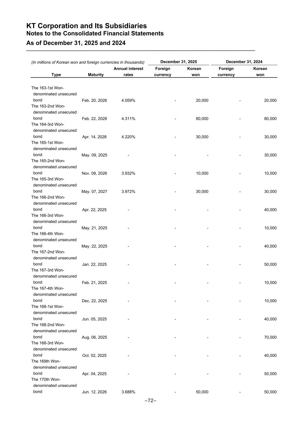 KT Corporation and Its Subsidiaries Notes to the Consolidated Financial Statements As of December 31, 2025 and 2024 (In millions of Korean won and foreign currencies in thousands) December 31, 2025 December 31, 2024 Type Maturity Annual interest rates Foreign currency Korean won Foreign currency Korean won The 163-1st Won- denominated unsecured bond Feb. 20, 2026 4.059% - 20,000 - 20,000 The 163-2nd Won- denominated unsecured bond Feb. 22, 2028 4.311% - 80,000 - 80,000 The 164-3rd Won- denominated unsecured bond Apr. 14, 2028 4.220% - 30,000 - 30,000 The 165-1st Won- denominated unsecured bond May. 09, 2025 - - - - 30,000 The 165-2nd Won- denominated unsecured bond Nov. 09, 2026 3.932% - 10,000 - 10,000 The 165-3rd Won- denominated unsecured bond May. 07, 2027 3.972% - 30,000 - 30,000 The 166-2nd Won- denominated unsecured bond Apr. 22, 2025 - - - - 40,000 The 166-3rd Won- denominated unsecured bond May. 21, 2025 - - - - 10,000 The 166-4th Won- denominated unsecured bond May. 22, 2025 - - - - 40,000 The 167-2nd Won- denominated unsecured bond Jan. 22, 2025 - - - - 50,000 The 167-3rd Won- denominated unsecured bond Feb. 21, 2025 - - - - 10,000 The 167-4th Won- denominated unsecured bond Dec. 22, 2025 - - - - 10,000 The 168-1st Won- denominated unsecured bond Jun. 05, 2025 - - - - 40,000 The 168-2nd Won- denominated unsecured bond Aug. 06, 2025 - - - - 70,000 The 168-3rd Won- denominated unsecured bond Oct. 02, 2025 - - - - 40,000 The 169th Won- denominated unsecured bond Apr. 04, 2025 - - - - 50,000 The 170th Won- denominated unsecured bond Jun. 12, 2026 3.688% - 50,000 - 50,000 -72-