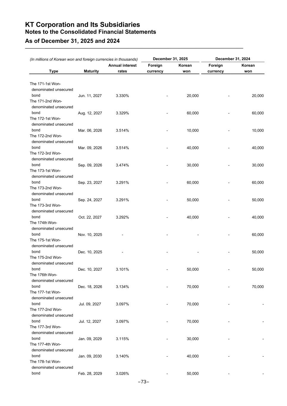 KT Corporation and Its Subsidiaries Notes to the Consolidated Financial Statements As of December 31, 2025 and 2024 (In millions of Korean won and foreign currencies in thousands) December 31, 2025 December 31, 2024 Type Maturity Annual interest rates Foreign currency Korean won Foreign currency Korean won The 171-1st Won- denominated unsecured bond Jun. 11, 2027 3.330% - 20,000 - 20,000 The 171-2nd Won- denominated unsecured bond Aug. 12, 2027 3.329% - 60,000 - 60,000 The 172-1st Won- denominated unsecured bond Mar. 06, 2026 3.514% - 10,000 - 10,000 The 172-2nd Won- denominated unsecured bond Mar. 09, 2026 3.514% - 40,000 - 40,000 The 172-3rd Won- denominated unsecured bond Sep. 09, 2026 3.474% - 30,000 - 30,000 The 173-1st Won- denominated unsecured bond Sep. 23, 2027 3.291% - 60,000 - 60,000 The 173-2nd Won- denominated unsecured bond Sep. 24, 2027 3.291% - 50,000 - 50,000 The 173-3rd Won- denominated unsecured bond Oct. 22, 2027 3.292% - 40,000 - 40,000 The 174th Won- denominated unsecured bond Nov. 10, 2025 - - - - 60,000 The 175-1st Won- denominated unsecured bond Dec. 10, 2025 - - - - 50,000 The 175-2nd Won- denominated unsecured bond Dec. 10, 2027 3.101% - 50,000 - 50,000 The 176th Won- denominated unsecured bond Dec. 18, 2026 3.134% - 70,000 - 70,000 The 177-1st Won- denominated unsecured bond Jul. 09, 2027 3.097% - 70,000 - - The 177-2nd Won- denominated unsecured bond Jul. 12, 2027 3.097% - 70,000 - - The 177-3rd Won- denominated unsecured bond Jan. 09, 2029 3.115% - 30,000 - - The 177-4th Won- denominated unsecured bond Jan. 09, 2030 3.140% - 40,000 - - The 178-1st Won- denominated unsecured bond Feb. 28, 2029 3.026% - 50,000 - - -73-